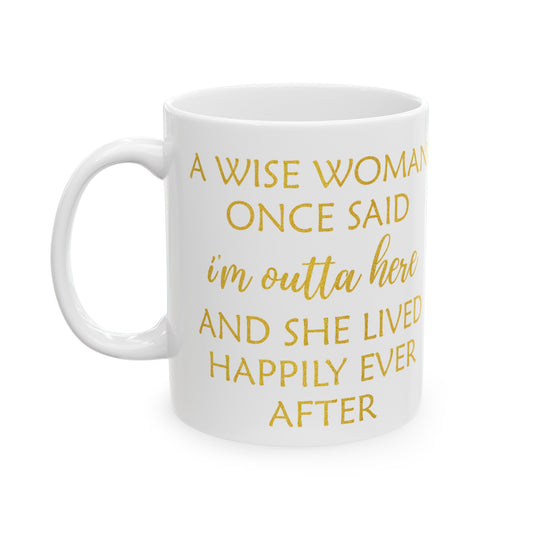 A Wise Woman Once Said I'm Outta Here Mug – White with Gold Lettering
