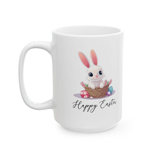 Happy Easter Bunny in Basket Mug – White Cup with Cute Pastel Eggs