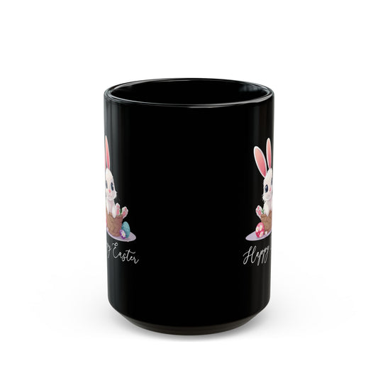 Happy Easter Bunny Mug – Black Coffee Cup with Cute Egg Basket Bunny