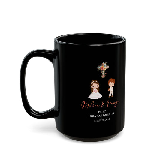Black First Holy Communion Mug – Gift for Melina & Henry 2025
