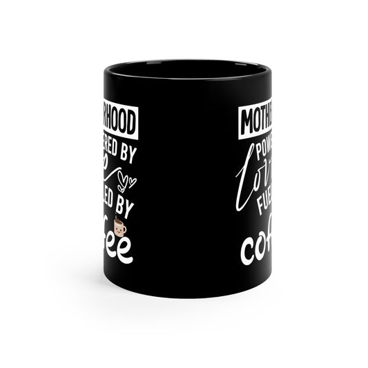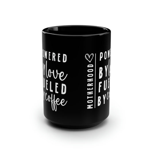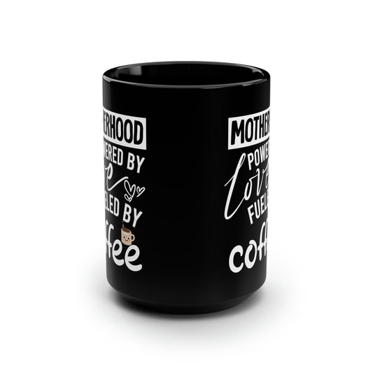 Motherhood Tall Black Mug – Powered by Love Fueled by Coffee