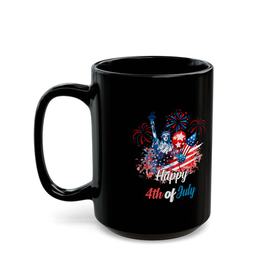 Happy 4th of July Black Mug – Statue of Liberty, Fireworks, Patriotic Gift