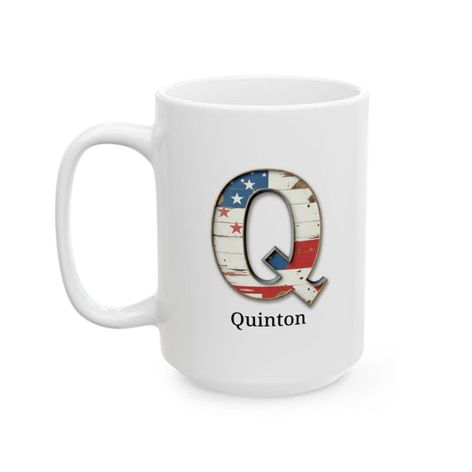 White American Flag Mug with Letter Q and Name Quinton Personalized Patriotic Coffee Cup Gift for Veterans Military or Proud Americans
