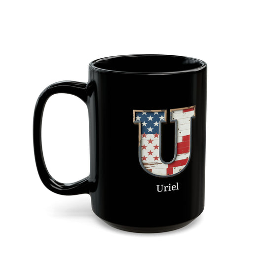 Black American Flag Mug with Letter U and Name Uriel Personalized Patriotic Coffee Cup Gift for Men Veterans or USA Supporters