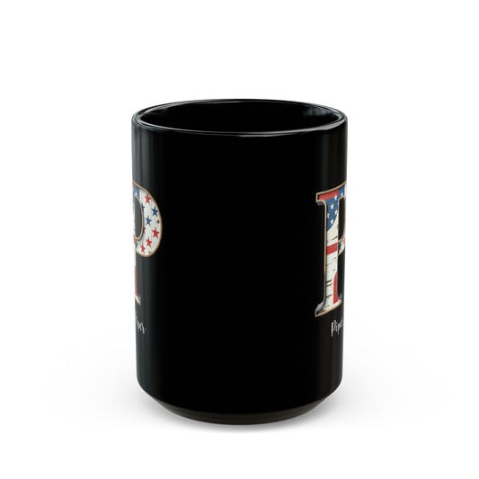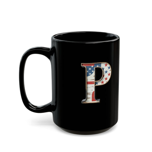 Black American Flag Mug with Letter P Patriotic Initial Coffee Cup Gift for Veterans Military Supporters or Proud Americans