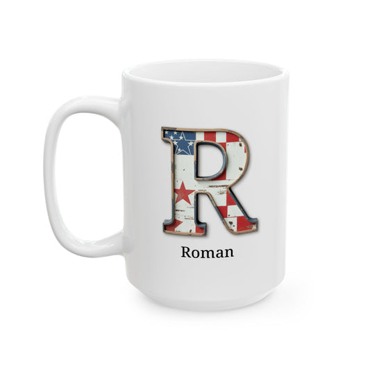 White American Flag Mug with Letter R and Name Roman Personalized Patriotic Coffee Cup Gift for Men Veterans or USA Flag Lovers