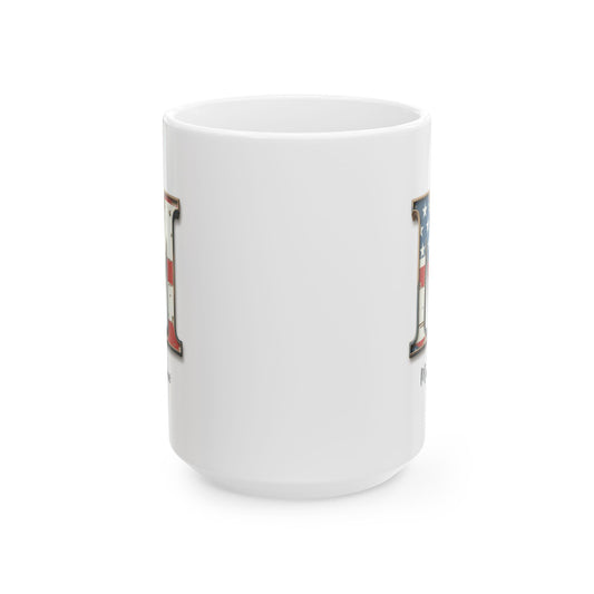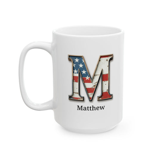 White American Flag Mug with Letter M and Name Matthew Personalized Patriotic Coffee Cup Gift for Veterans Military or Proud Americans