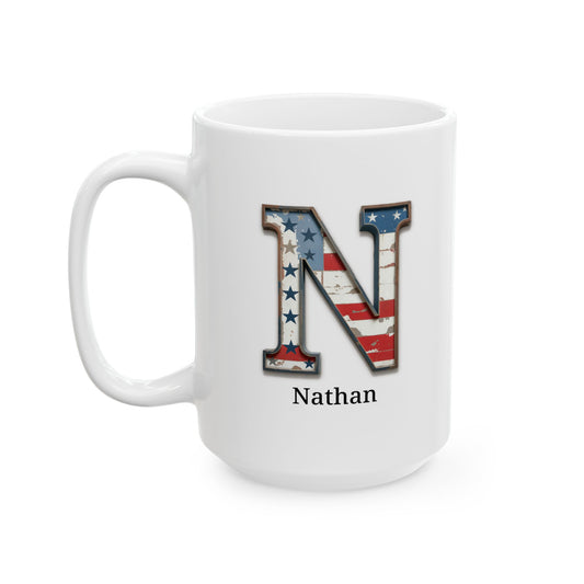 White American Flag Mug with Letter N and Name Nathan Personalized Patriotic Coffee Cup Gift for Veterans Military or Proud Americans