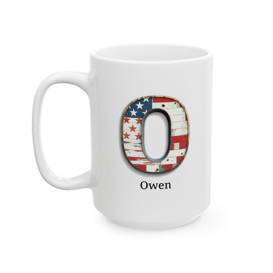 White American Flag Mug with Letter O and Name Owen Personalized Patriotic Coffee Cup Gift for Veterans Military Families or Proud Americans