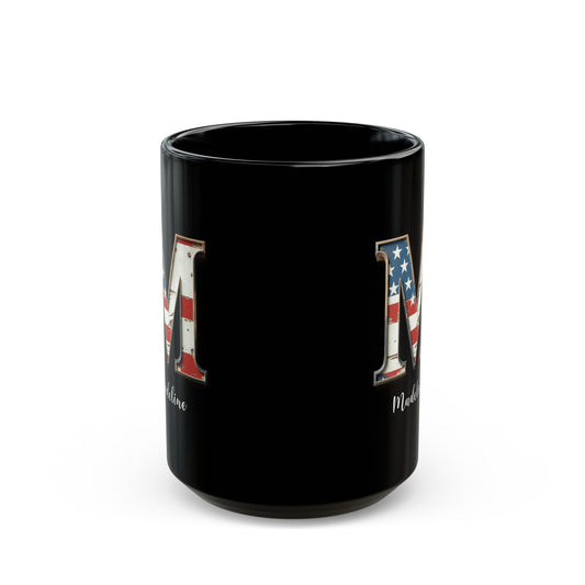 Black American Flag Mug with Letter M and Name Matthew Personalized Patriotic Coffee Cup Gift for Men Veterans or Proud USA Supporters