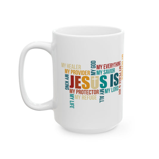 Jesus Is Word Cloud White Mug – Christian Faith Inspiration
