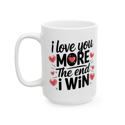 I Love You More The End I Win Mug – Bold Black Text with Hearts – Cute Romantic Gift