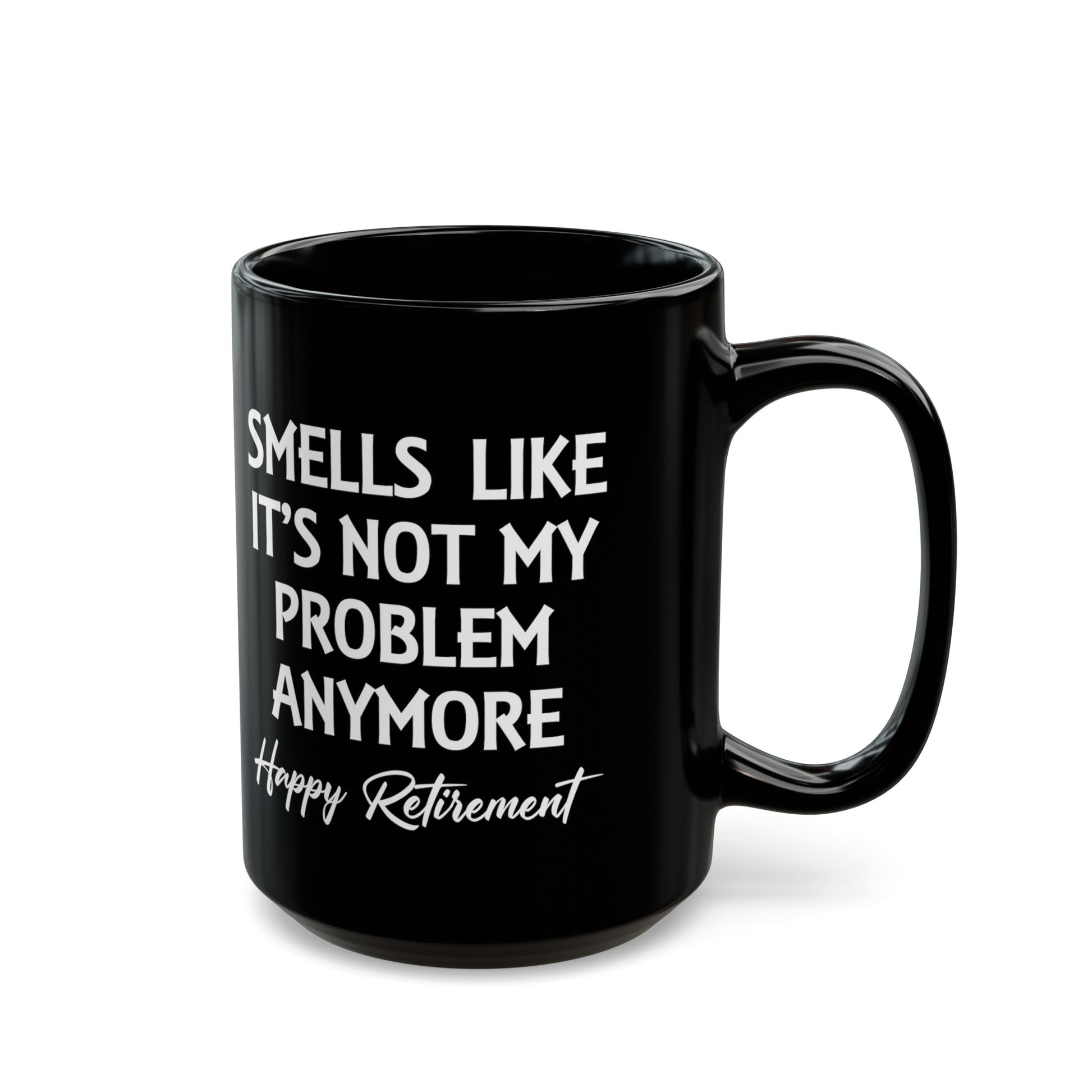 Step into retirement with style and a bit of humor with our black "Smells Like It's Not My Problem Anymore" mug. A perfect gift for retirees, this mug offers a cheeky nod to their newfound freedom from daily responsibilities. It's the ideal companion for morning coffees or leisurely teas, celebrating life after work with a smile.