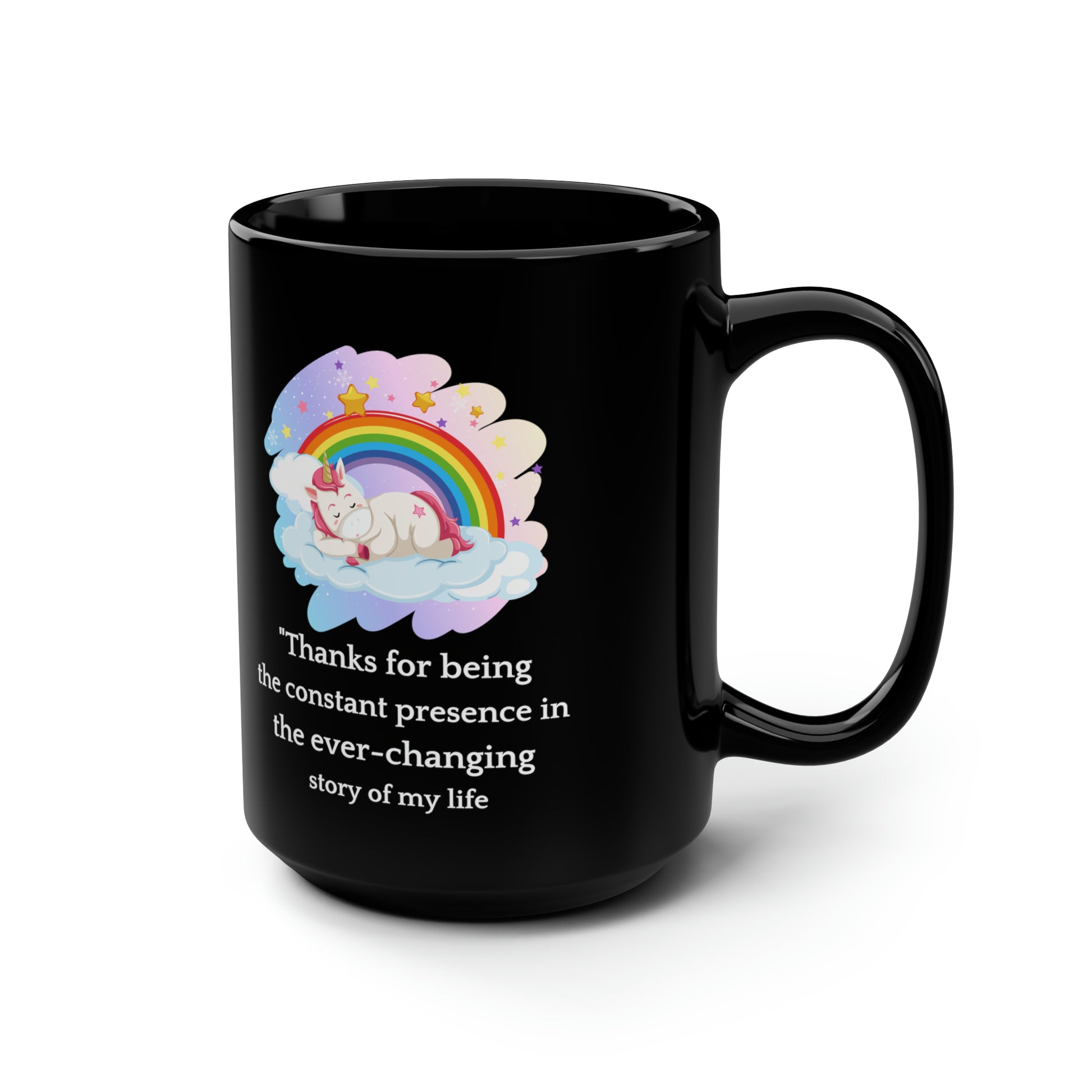 Delight a special person with this magical black unicorn mug, featuring a whimsical unicorn on a cloud with a vibrant rainbow and the heartfelt quote: