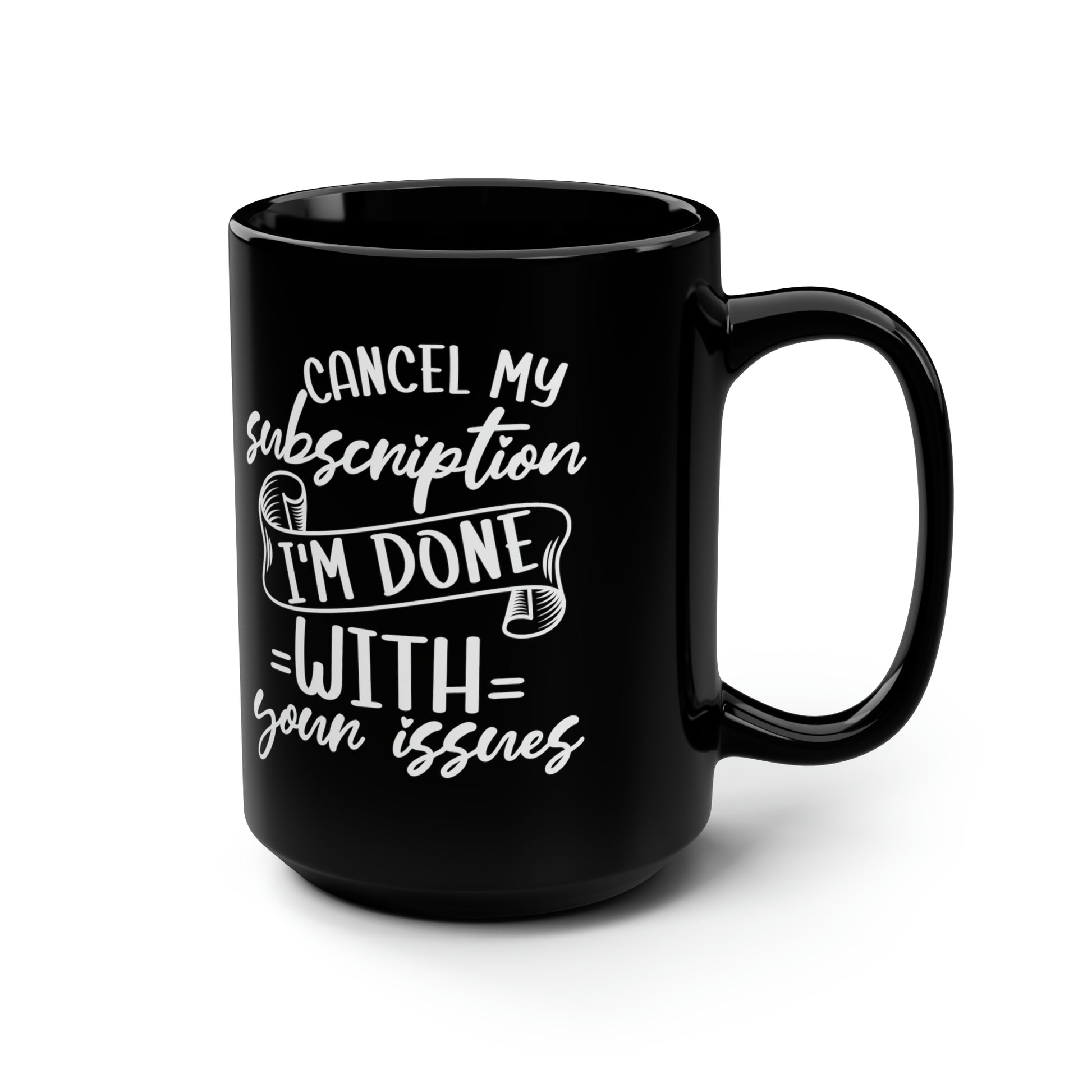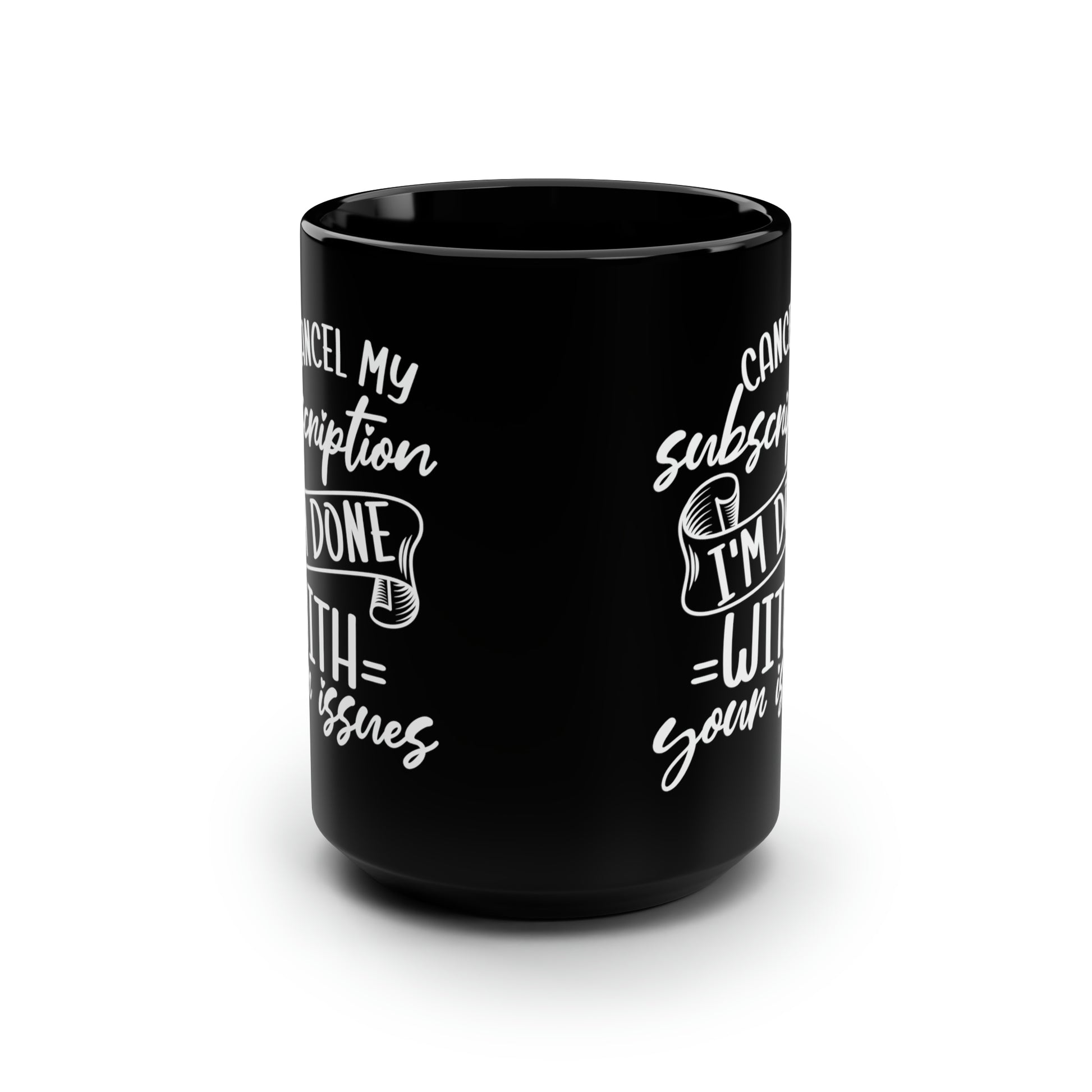 Add some humor to your morning routine with this bold black coffee mug that says it all—"Cancel My Subscription, I’m Done with Your Issues." Whether it's for yourself or a sarcastic friend, this mug will brighten anyone’s day with its witty message. Enjoy your coffee in style with a reminder that sometimes, it's okay to walk away from the drama.