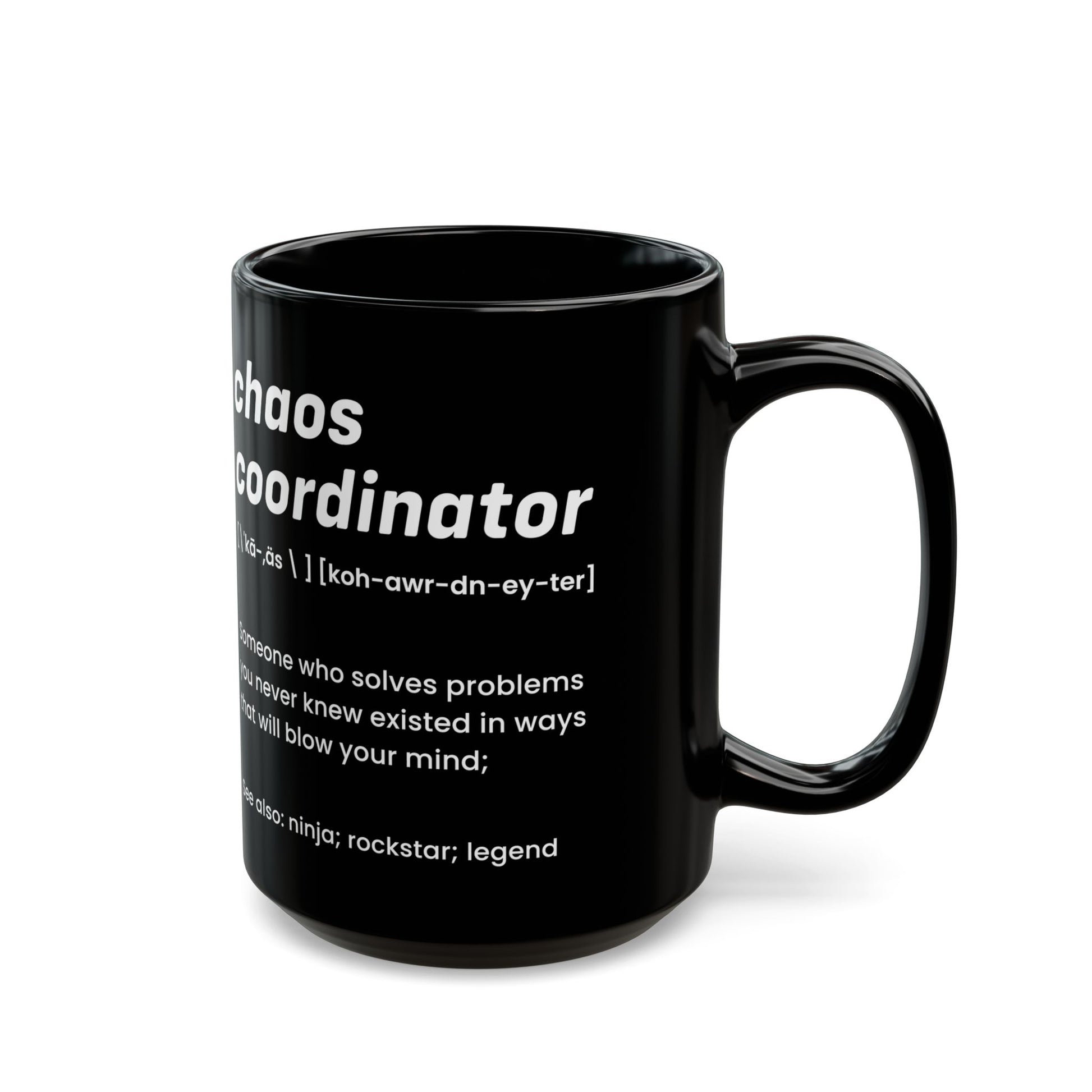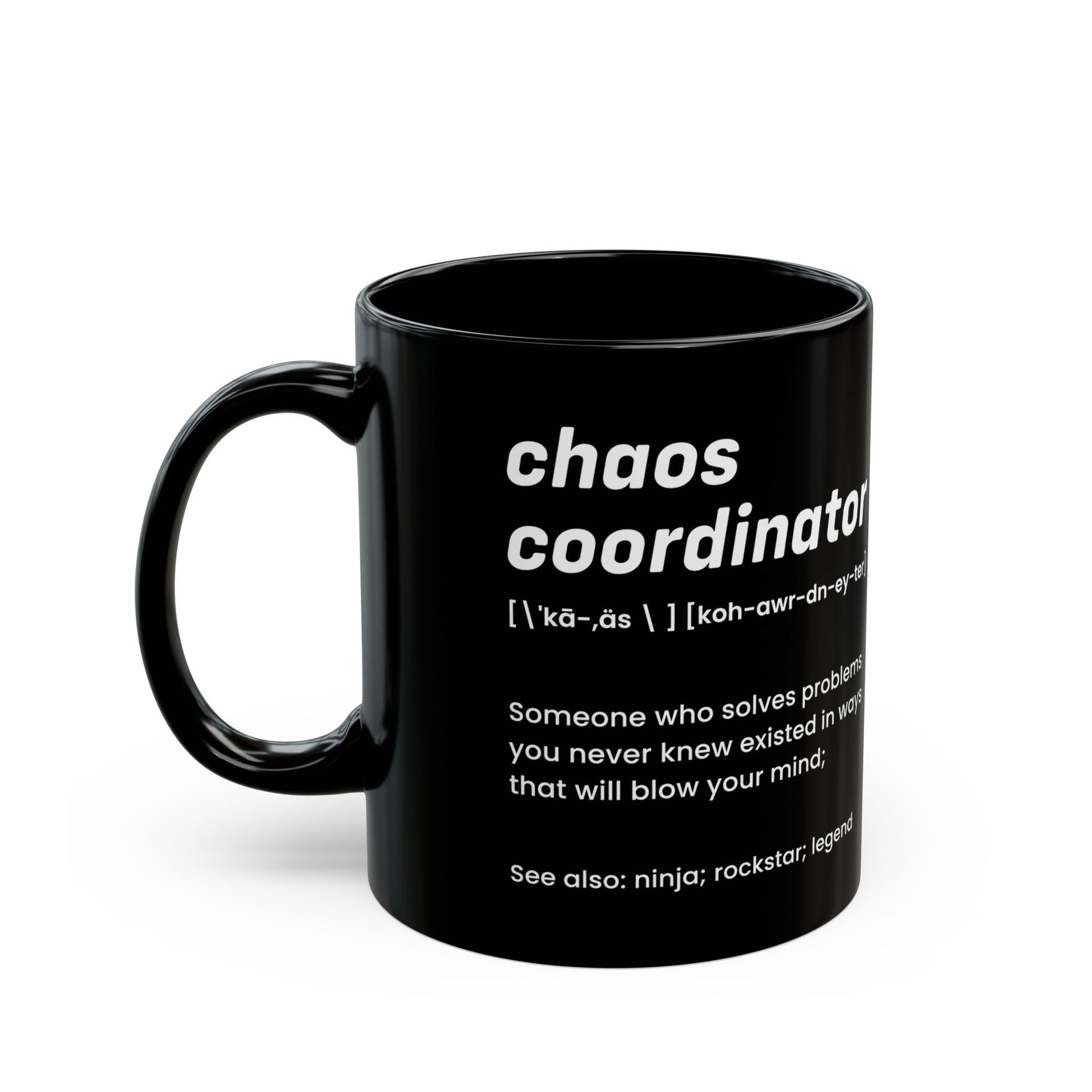 Black Chaos Coordinator Definition Mug – Funny Minimalist Ceramic Coffee Cup Gift for Boss, Office Manager, or Coworker – Ninja Rockstar Legend