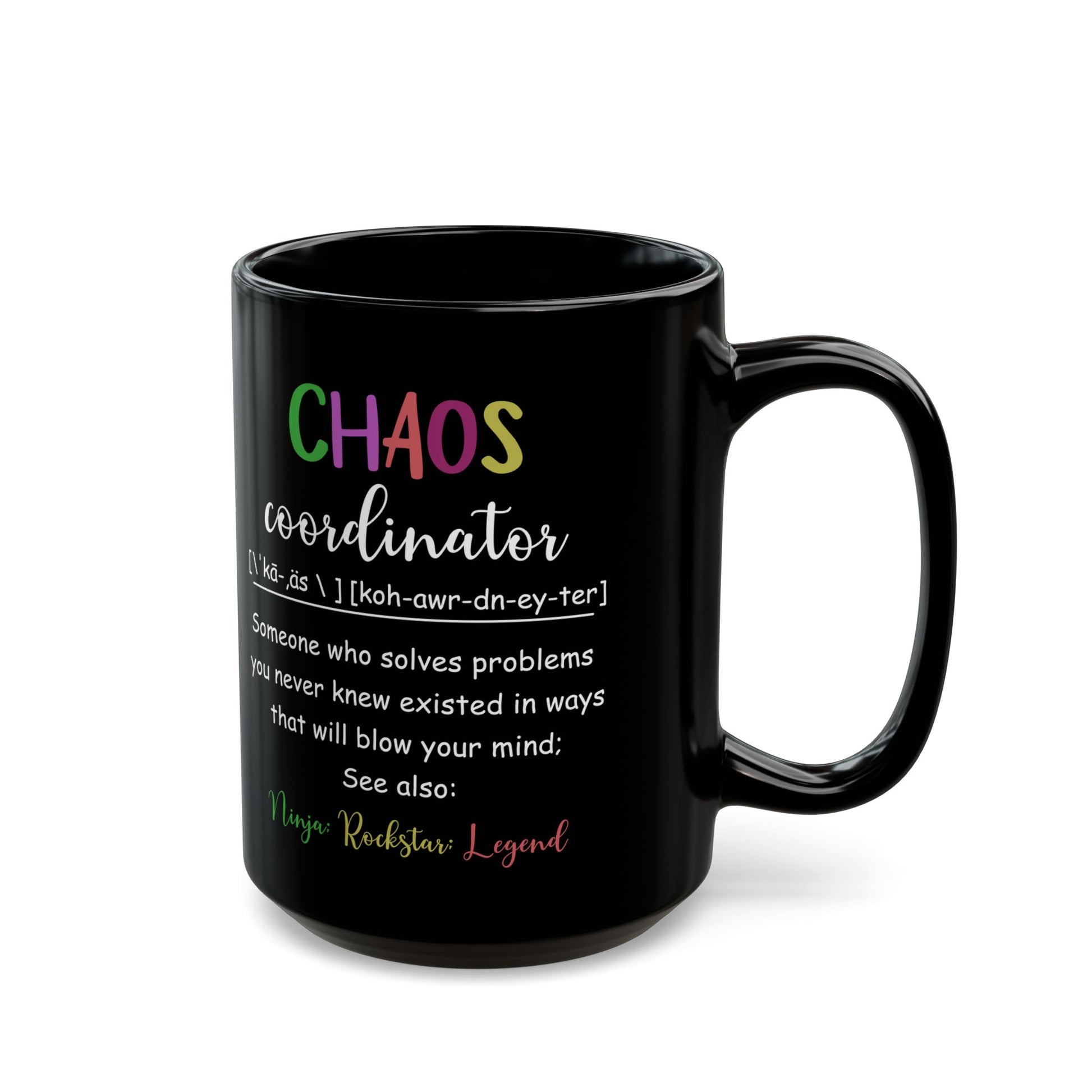 Funny Chaos Coordinator Mug – Black Ceramic Coffee Cup for Boss, Teacher, Mom, or Office Coworker – Ninja Rockstar Legend Definition Gift