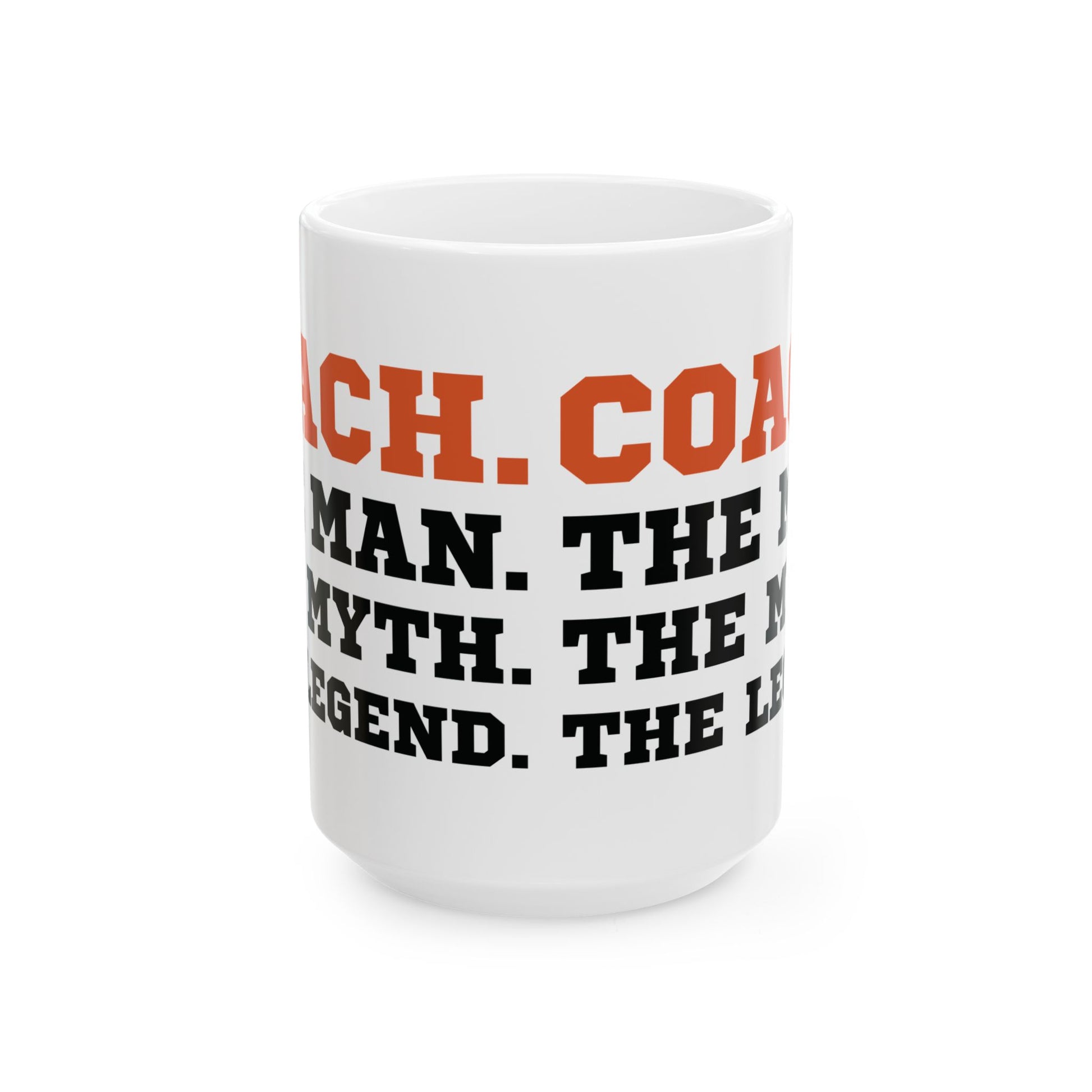 Make your coach feel legendary with this bold white ceramic mug featuring the famous phrase: “Coach. The Man. The Myth. The Legend.” The message is delivered in striking black and orange block typography, making it the perfect gift to honor your coach.