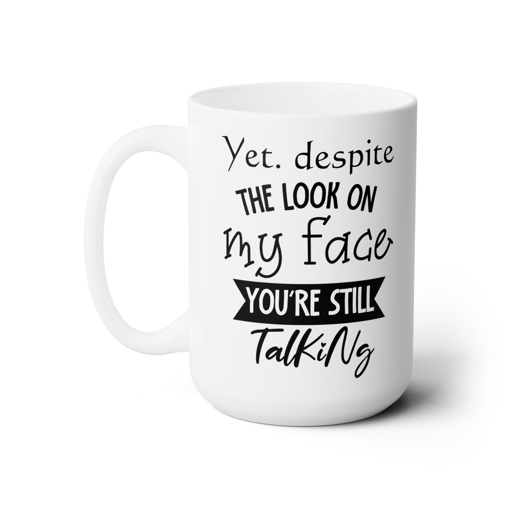 This "Yet, despite the look on my face, you're still talking" coffee mug is perfect for those who appreciate sarcasm and want to make a bold statement with their drinkware. Whether you're enjoying your morning coffee or need a conversation starter, this mug's witty design is sure to make an impression. The perfect gift for friends and family who share your sense of humor.