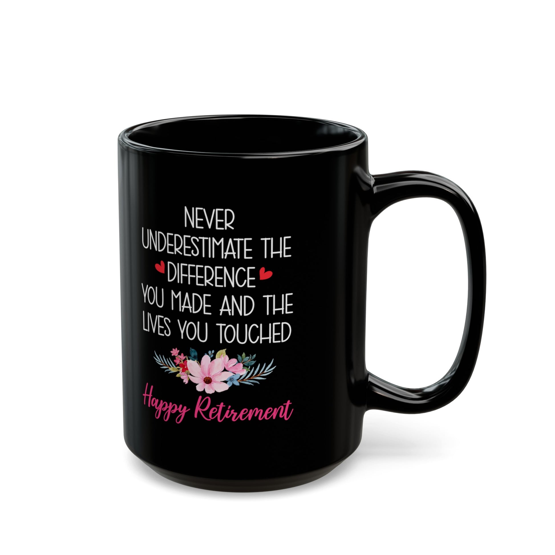 Celebrate the end of an era with this elegant black mug, perfect for any retiree who has left a lasting impact. The mug features the powerful message, "Never underestimate the difference you made and the lives you touched," complemented by subtle floral accents and vibrant touches of color. It's not just a mug; it's a token of appreciation for years of dedication and service.