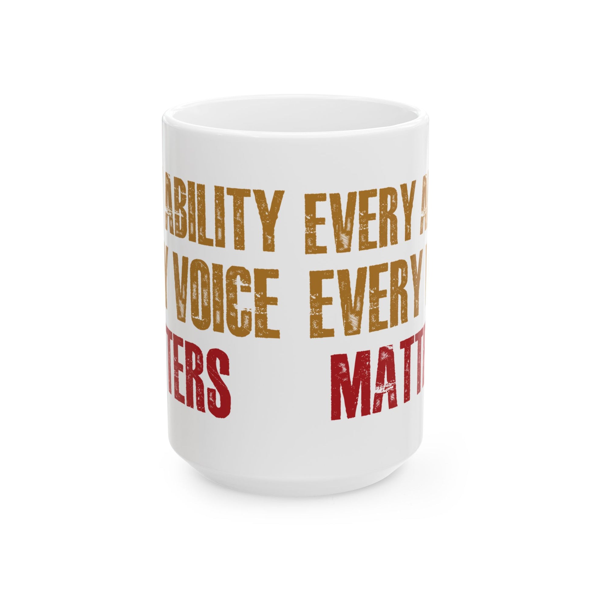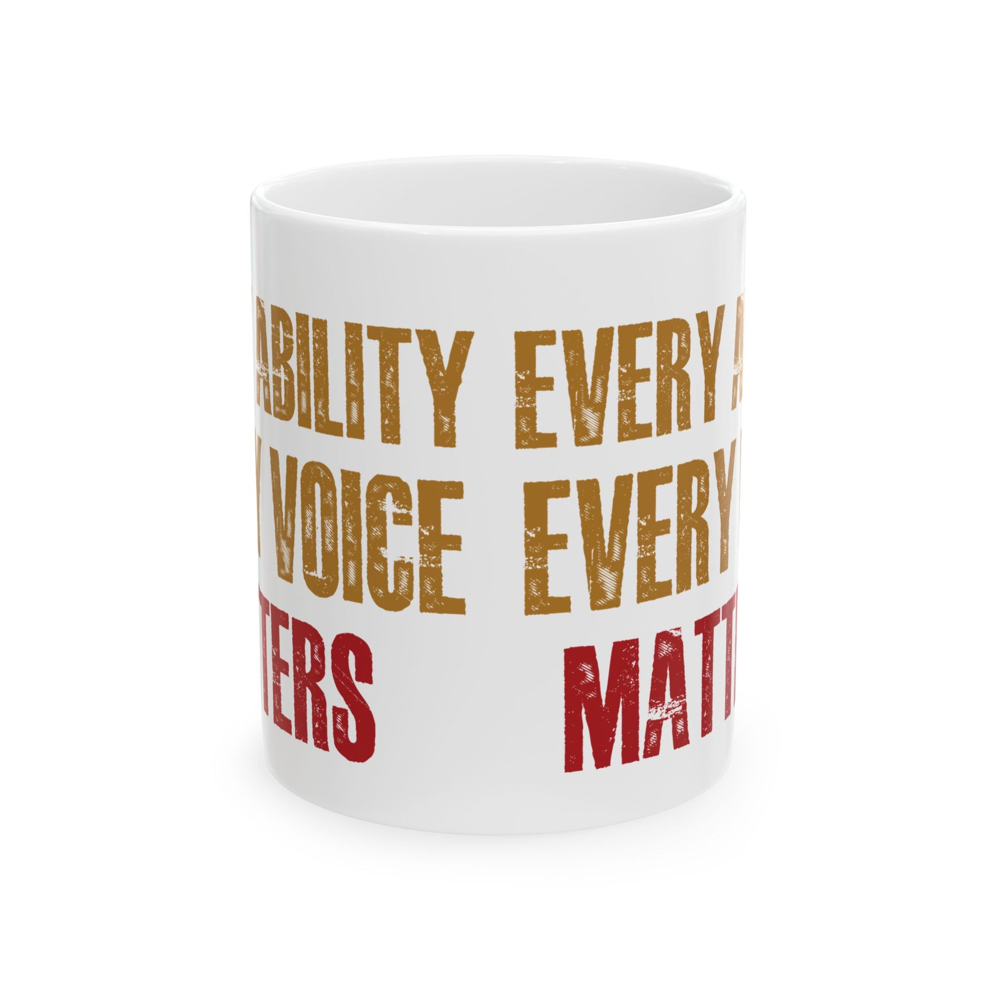 Celebrate inclusion, pride, and advocacy with this inspiring “Every Ability Every Voice Matters” white ceramic mug. Featuring bold, distressed lettering in gold and red, this mug makes a powerful daily reminder to uplift every voice and embrace every ability.