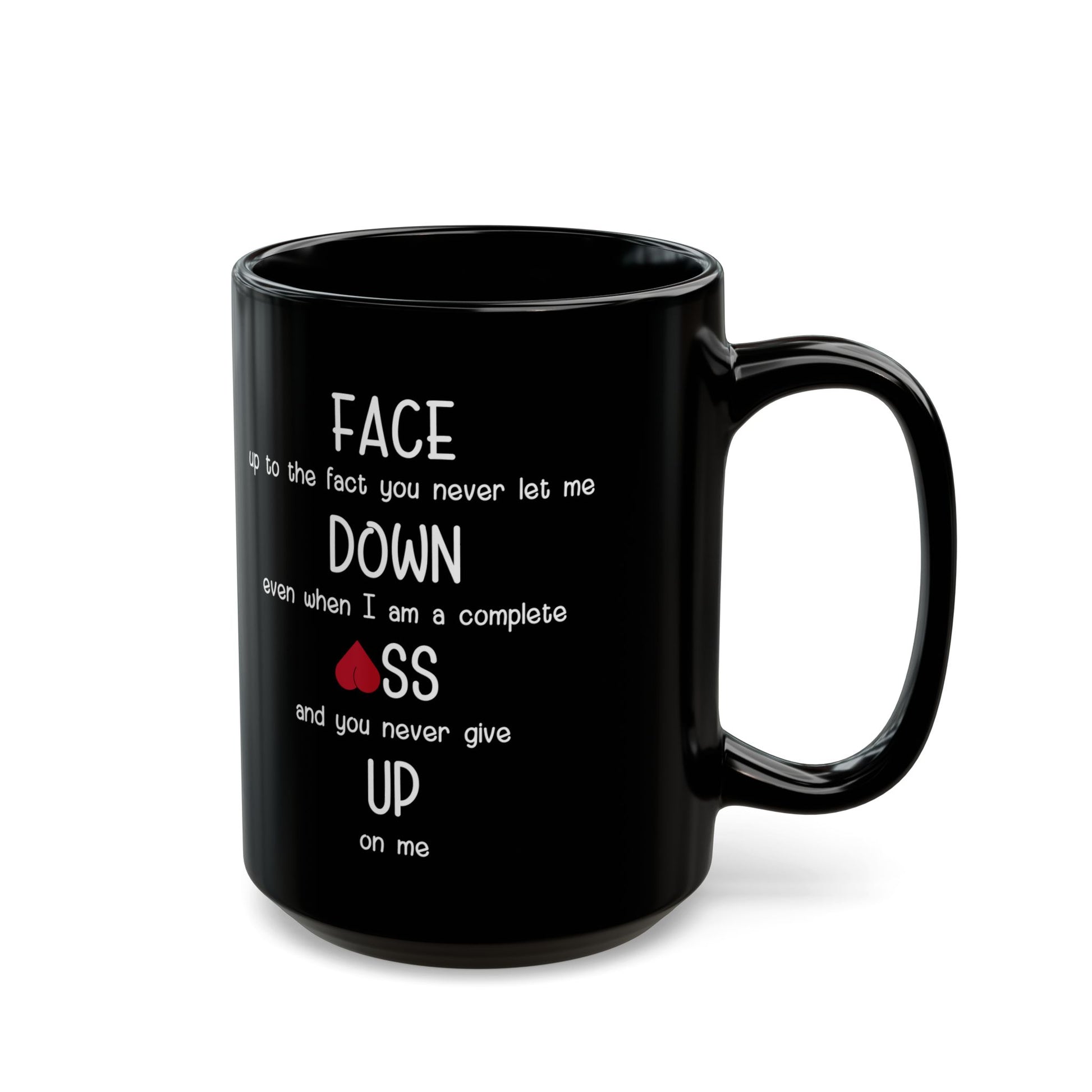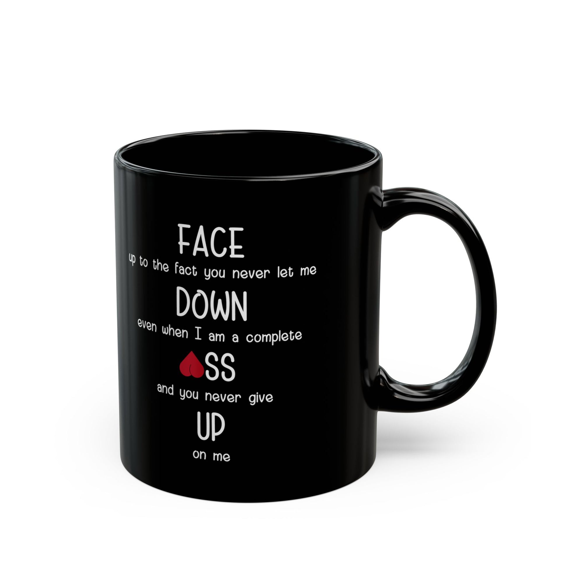 Show your love with a twist of humor! This bold black ceramic mug features a playful and cheeky message that reads: