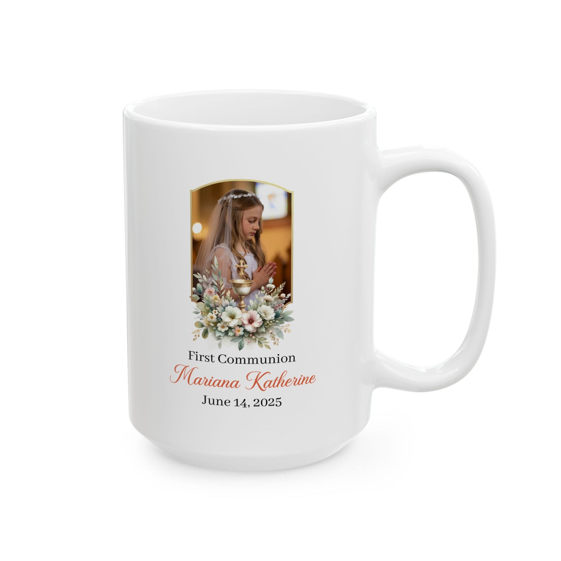 Custom First Communion Gift Mug for Girl – Personalized Keepsake with Name, Date & Photo – Floral Religious Gift for Catholic Celebration