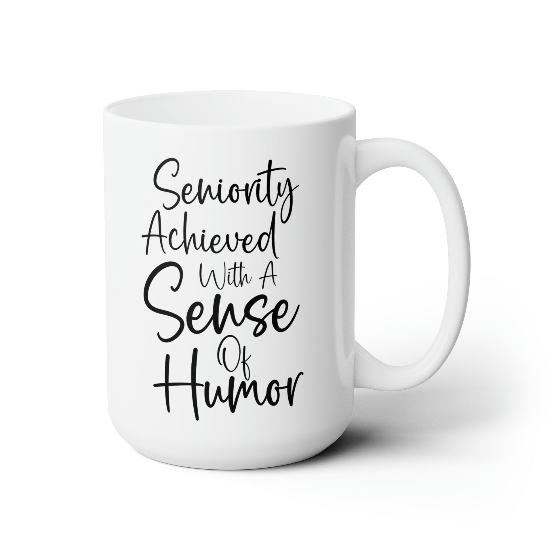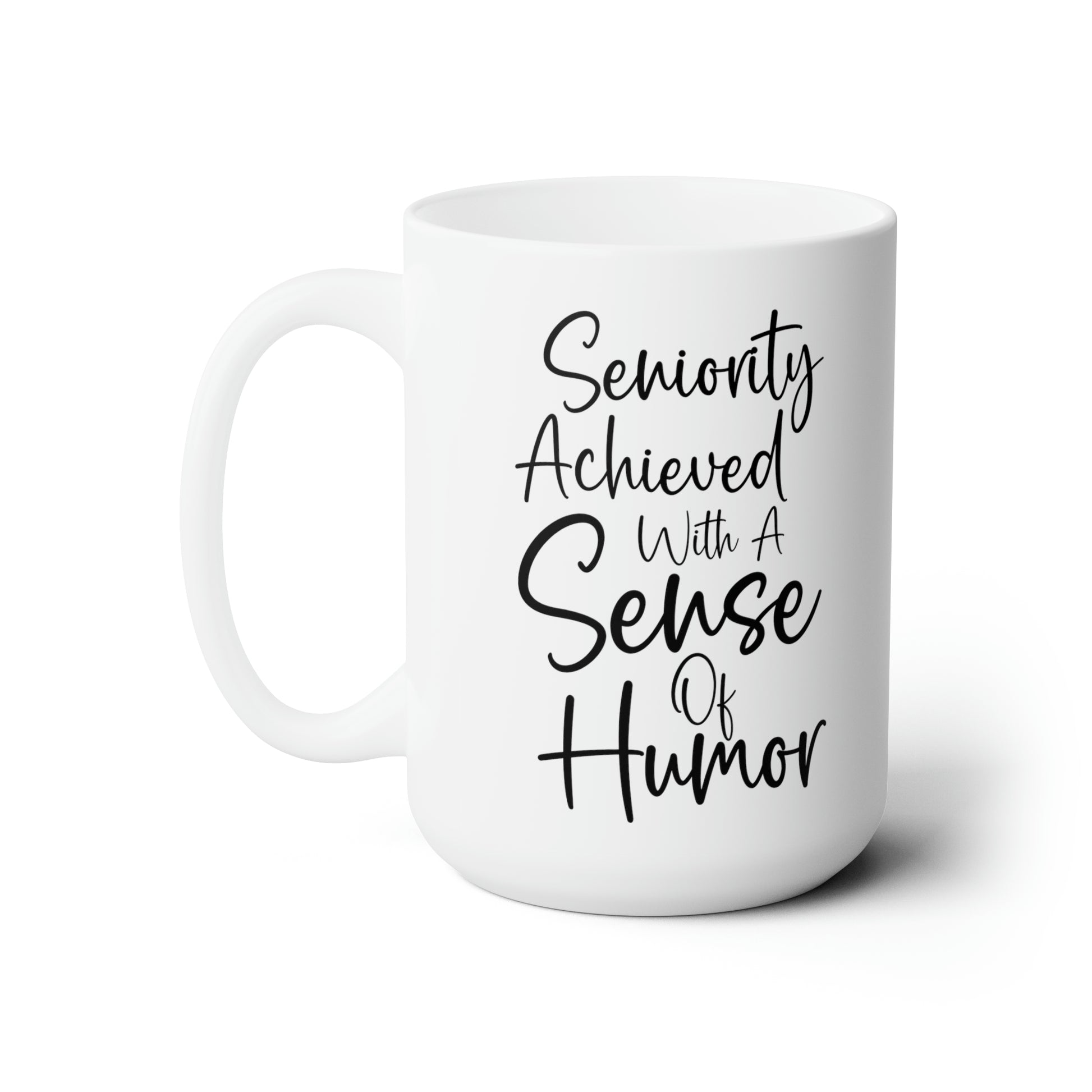 Enjoy your coffee with a touch of humor! This high-quality ceramic mug features the phrase "Seniority Achieved with a Sense of Humor," making it the perfect gift for retirees, grandparents, and anyone who embraces aging with wit. Dishwasher and microwave safe, this mug is ideal for everyday use. Whether it's a birthday, retirement party, or just because, this cup will bring a smile to anyone who receives it.