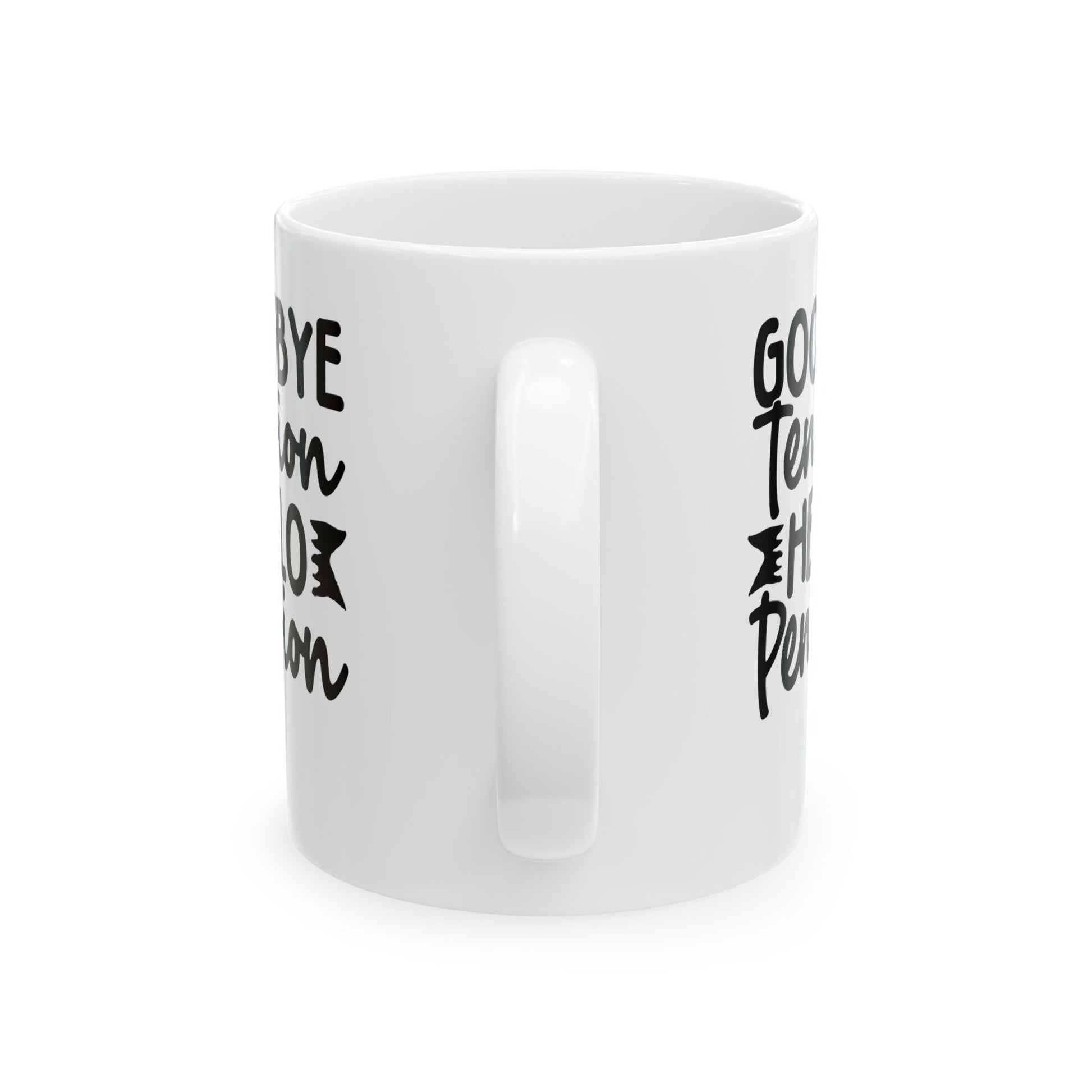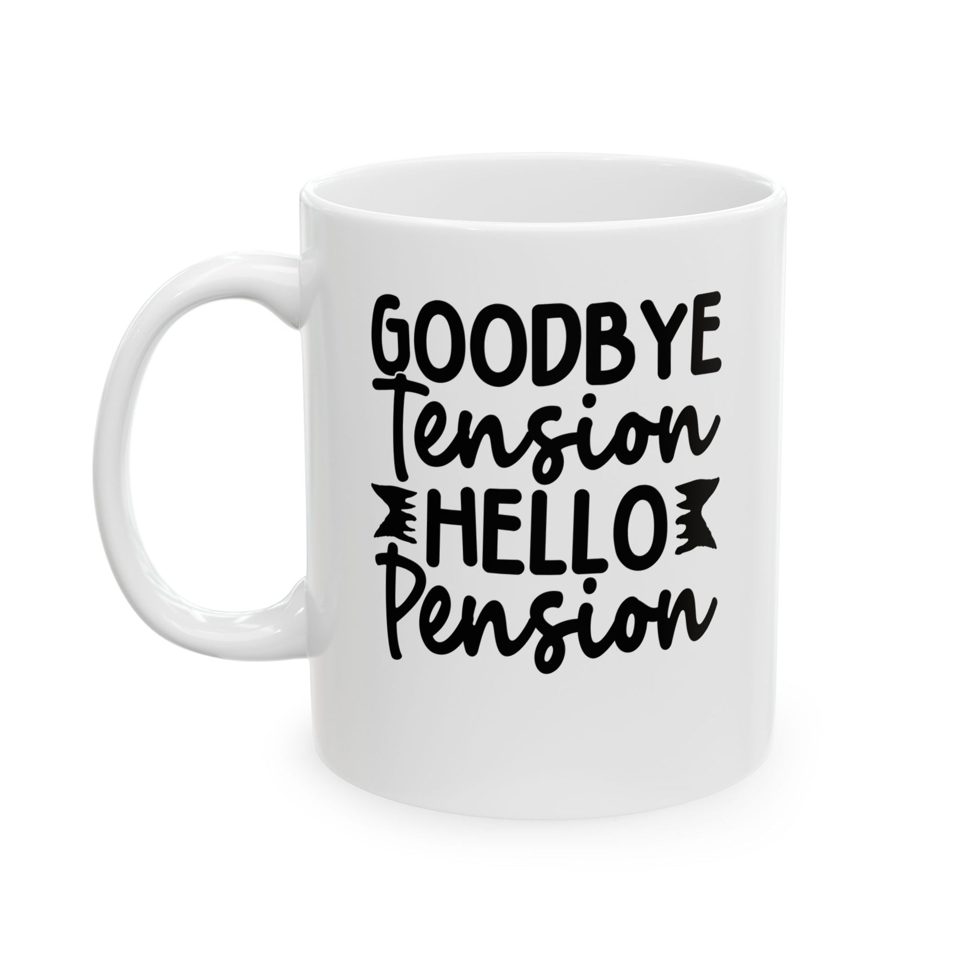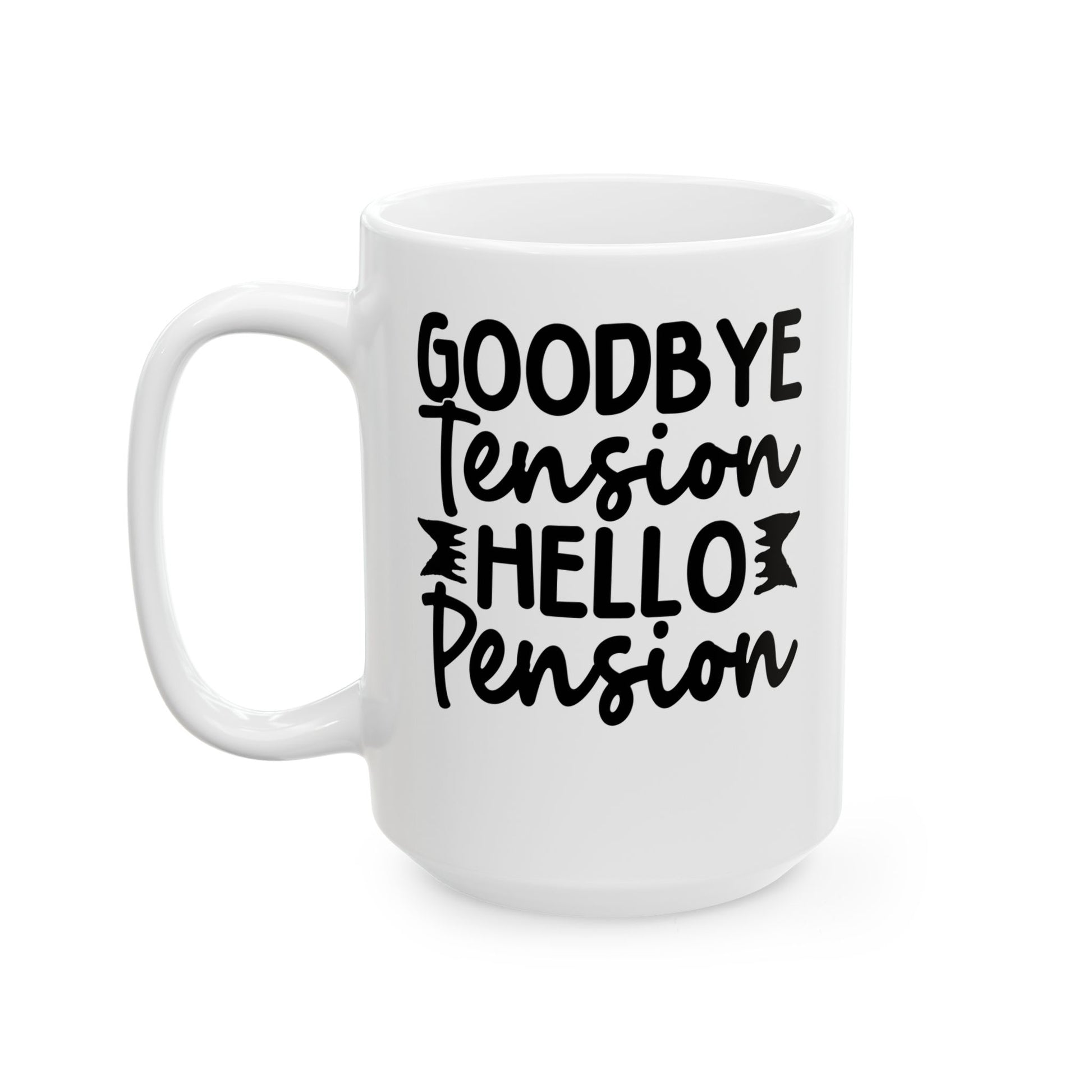 Goodbye Tension, Hello Pension White Mug, (11oz, 15oz)