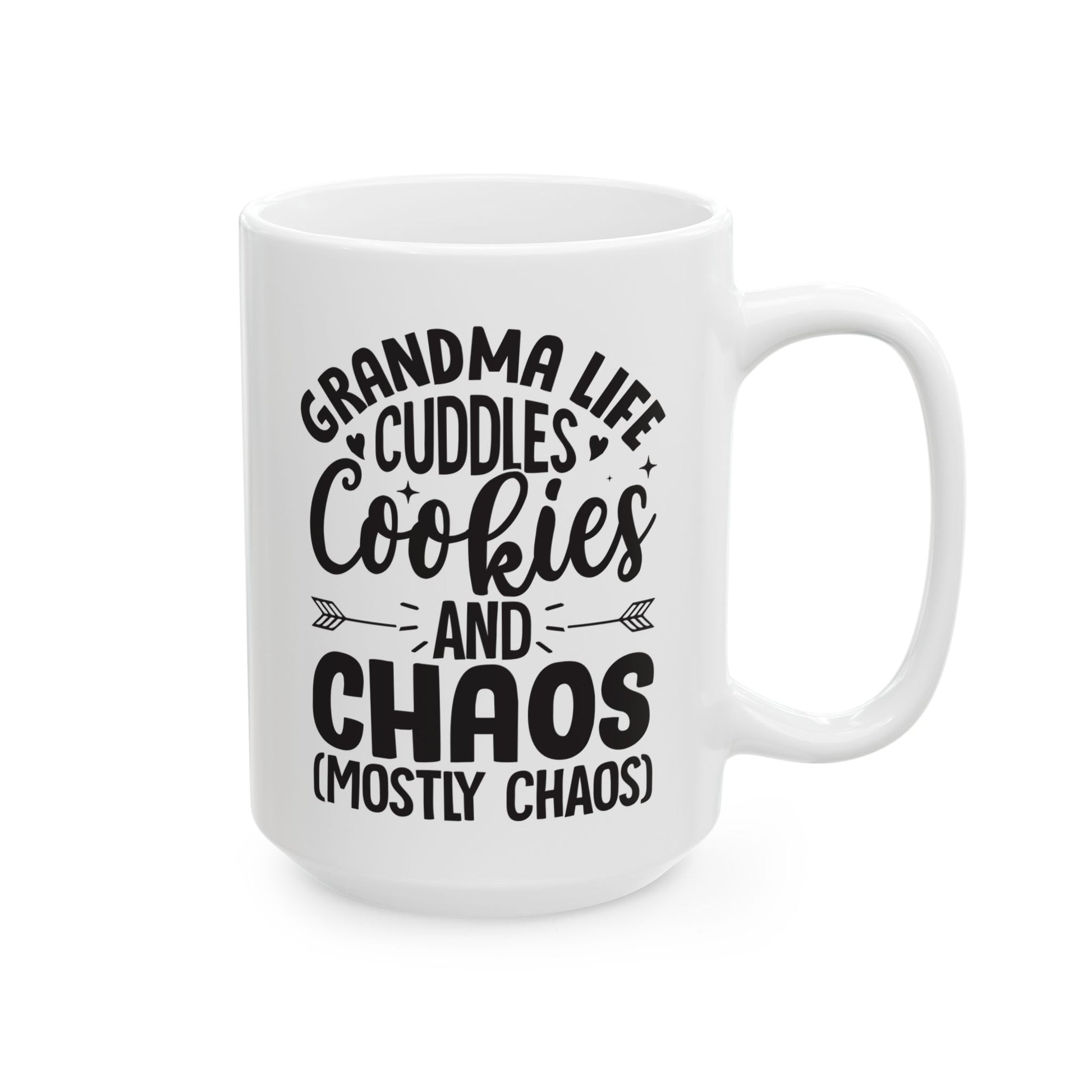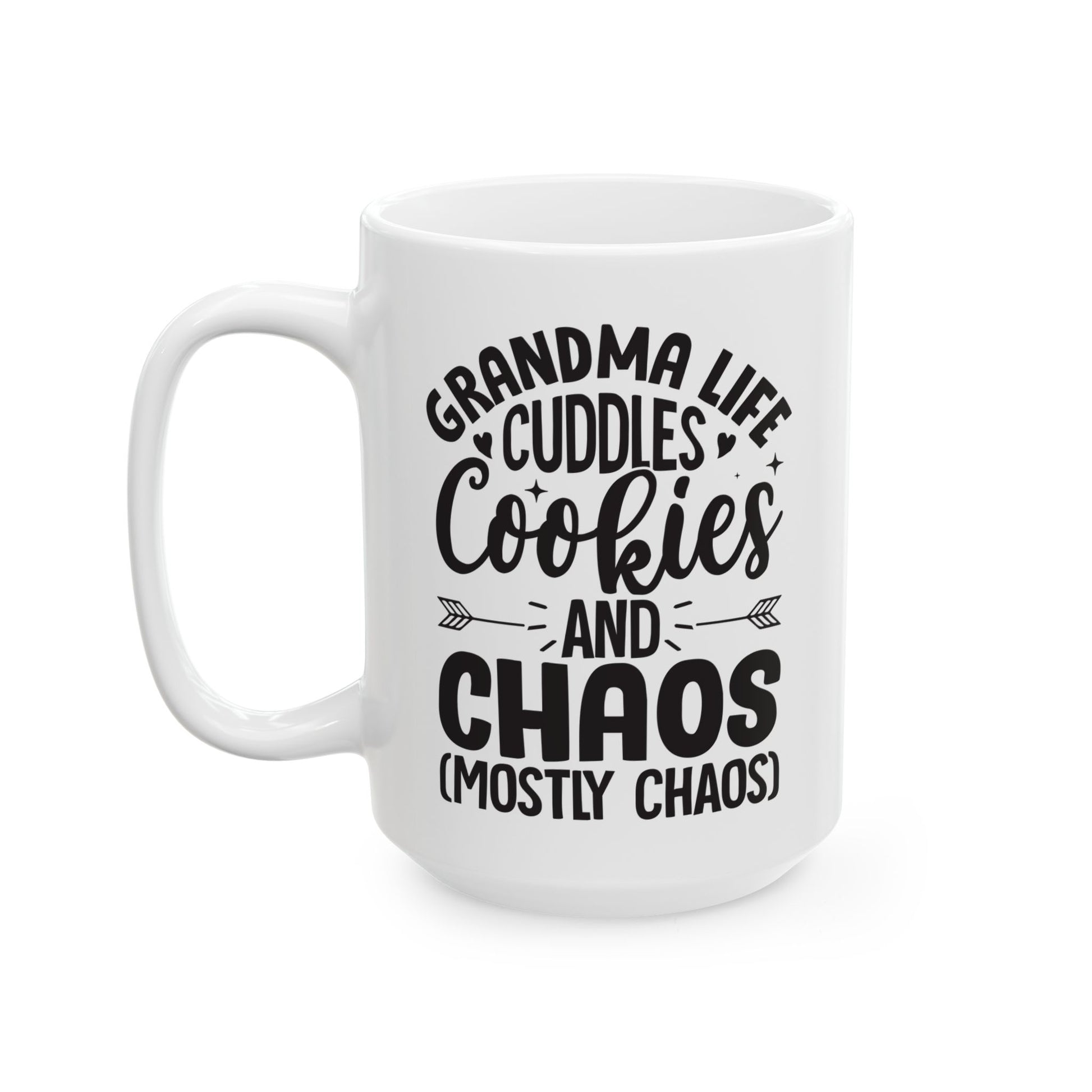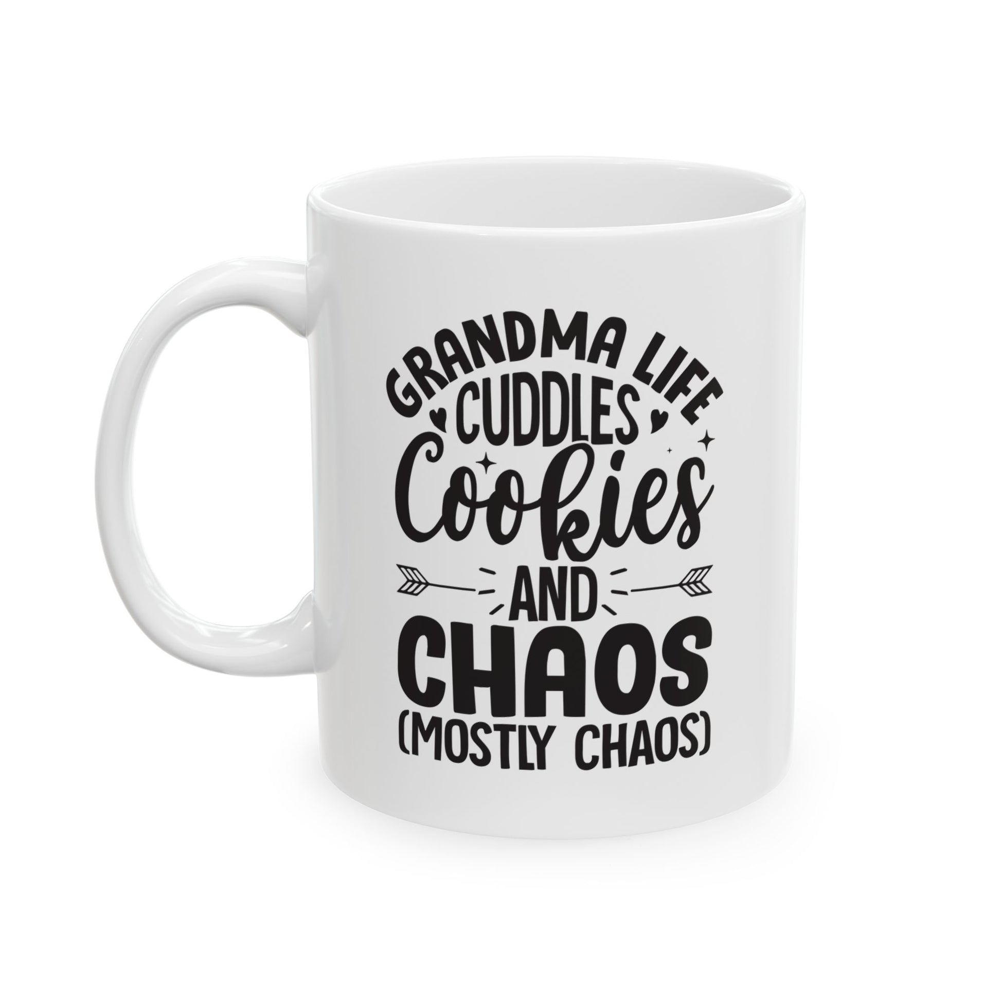 Grandma Life Cuddles Cookies and Chaos Mostly Chaos White Mug, (11oz, 15oz)
