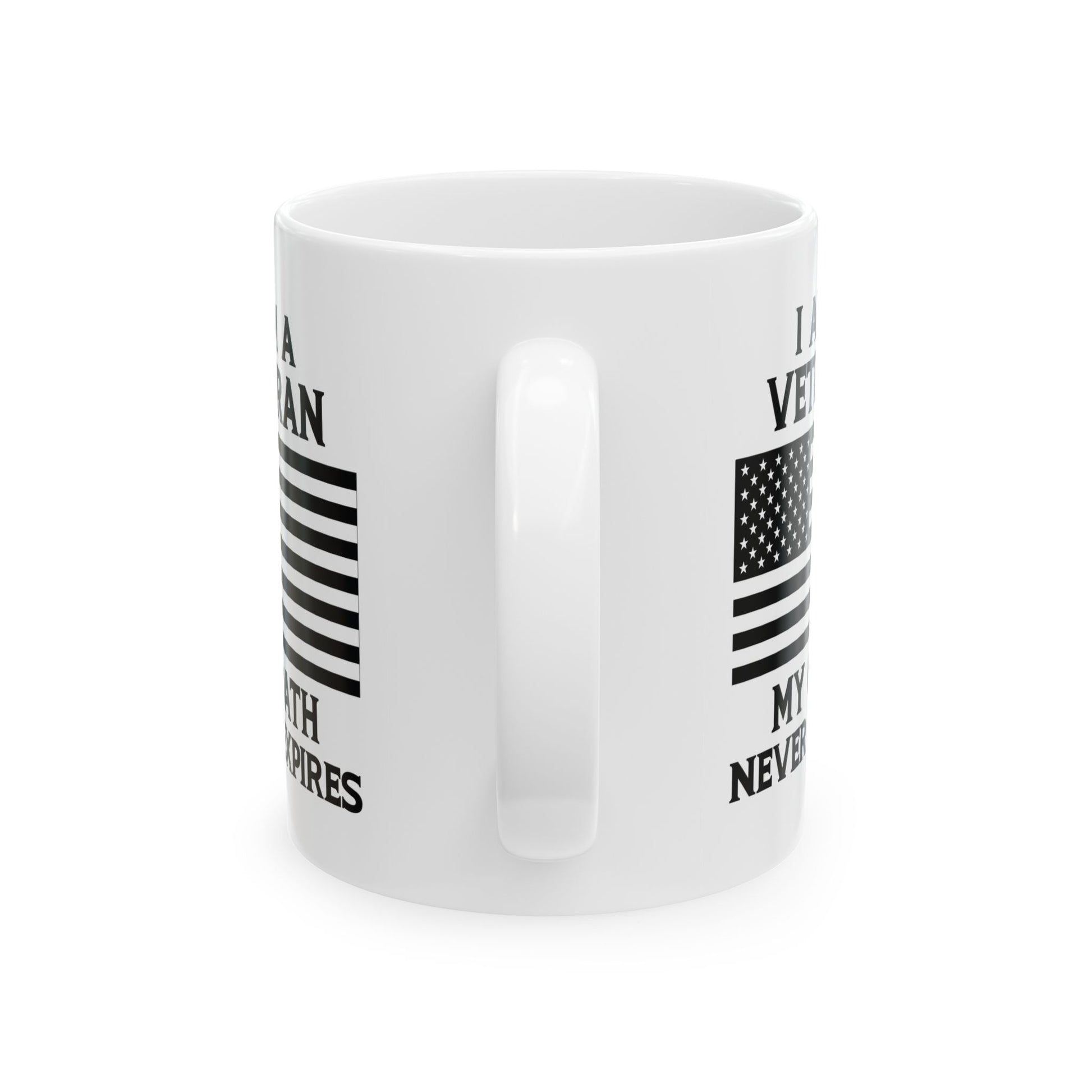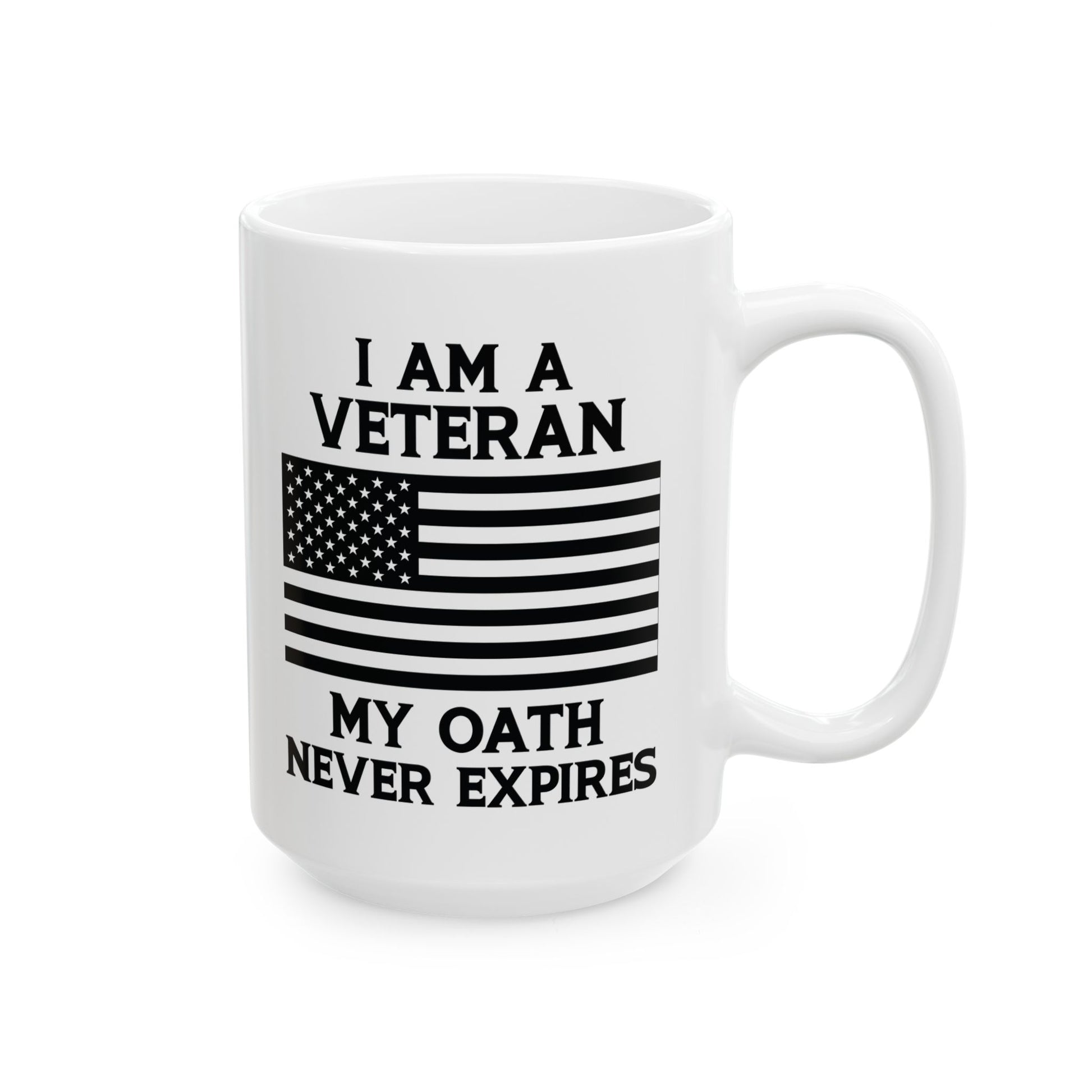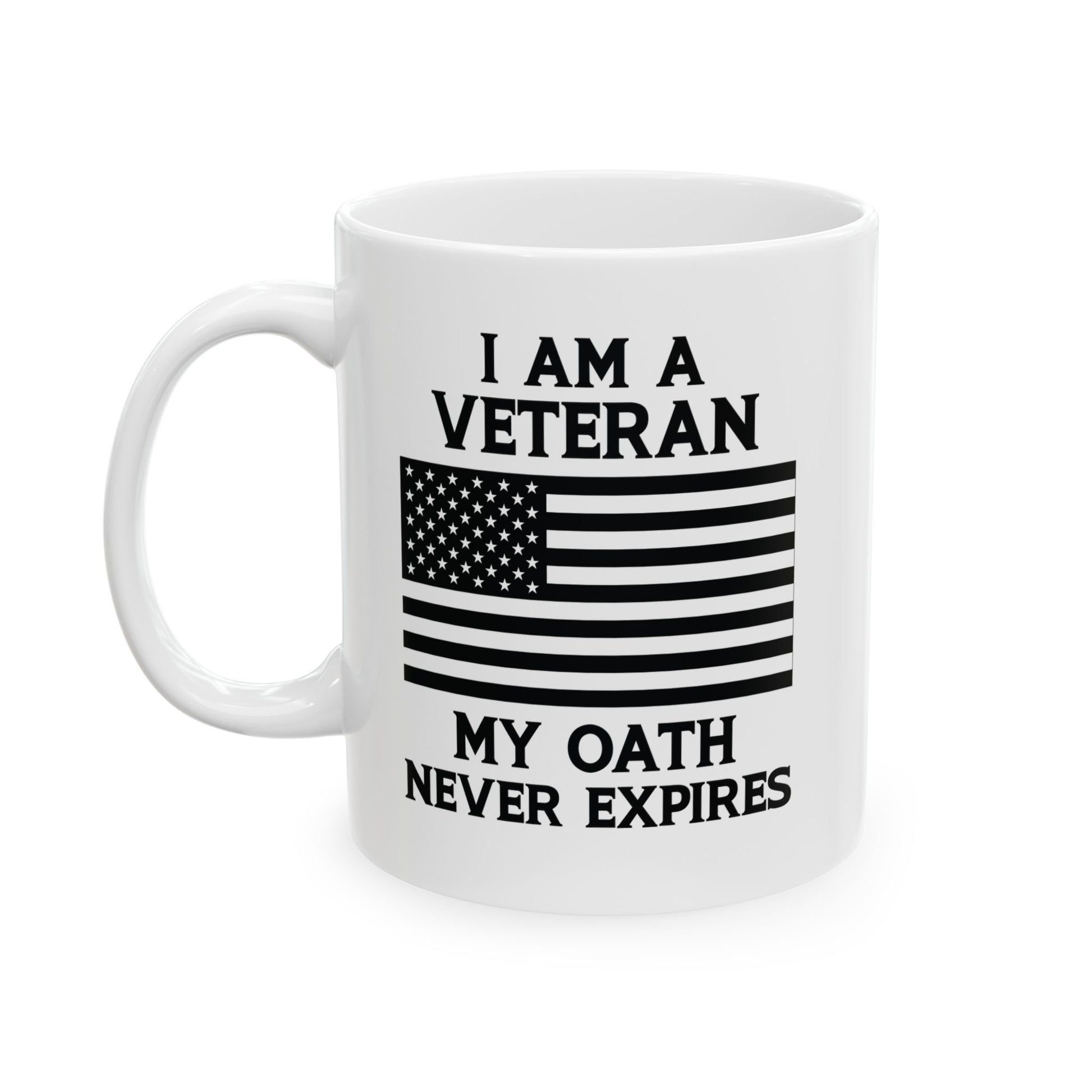 Honor the lifelong commitment of military service with this powerful white ceramic mug. Featuring the iconic phrase “I Am a Veteran, My Oath Never Expires” and a bold American flag design, this mug is a daily reminder of the dedication and sacrifice veterans embody.