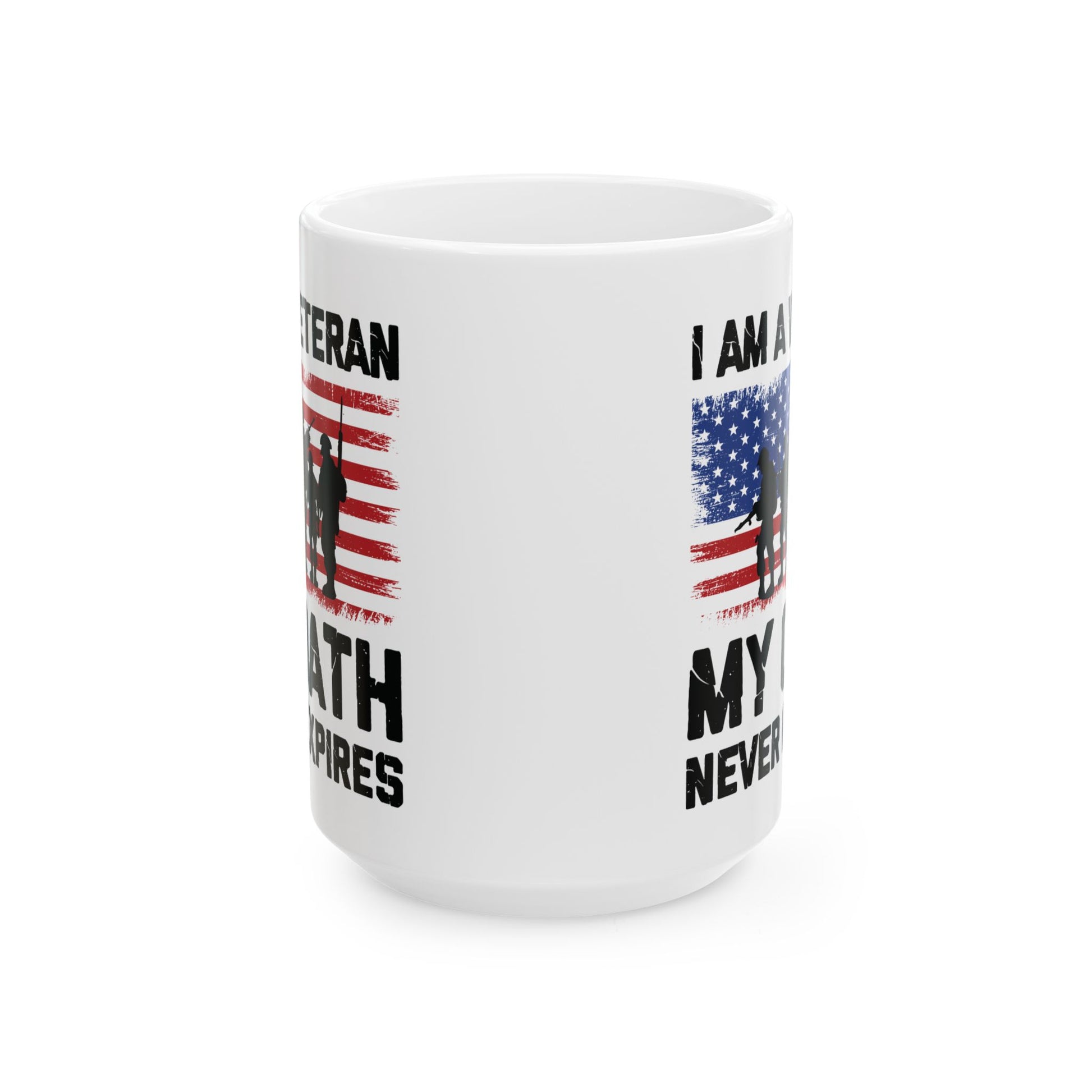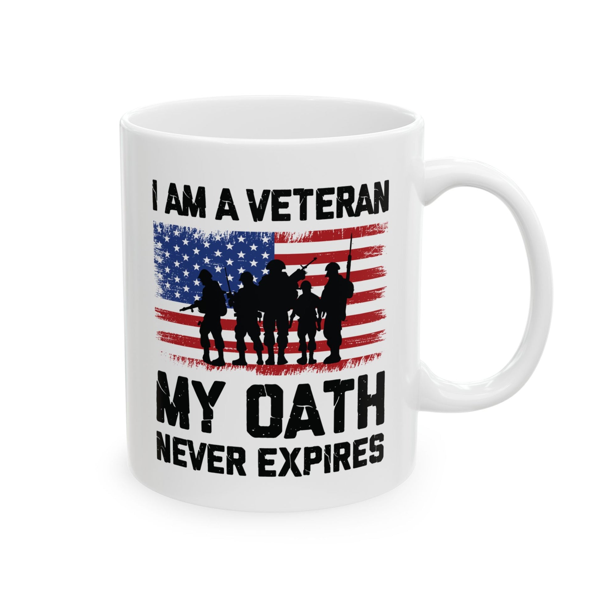 Celebrate patriotism and service with this white ceramic mug proudly featuring the bold declaration “I Am a Veteran, My Oath Never Expires.” The design showcases brave soldiers standing in front of a distressed American flag – a strong tribute to the enduring commitment of our military heroes.