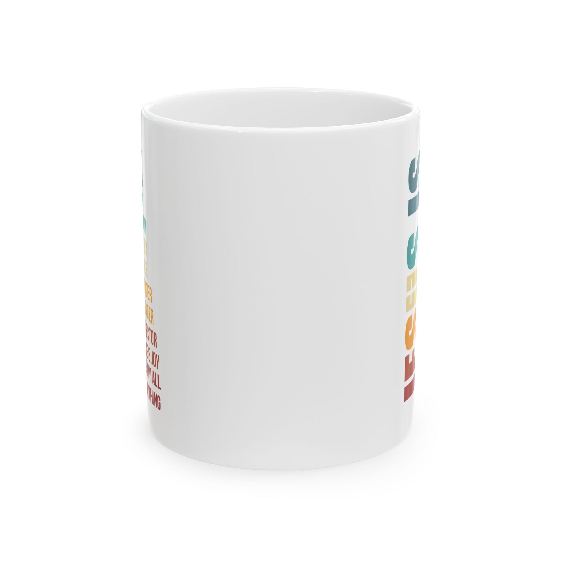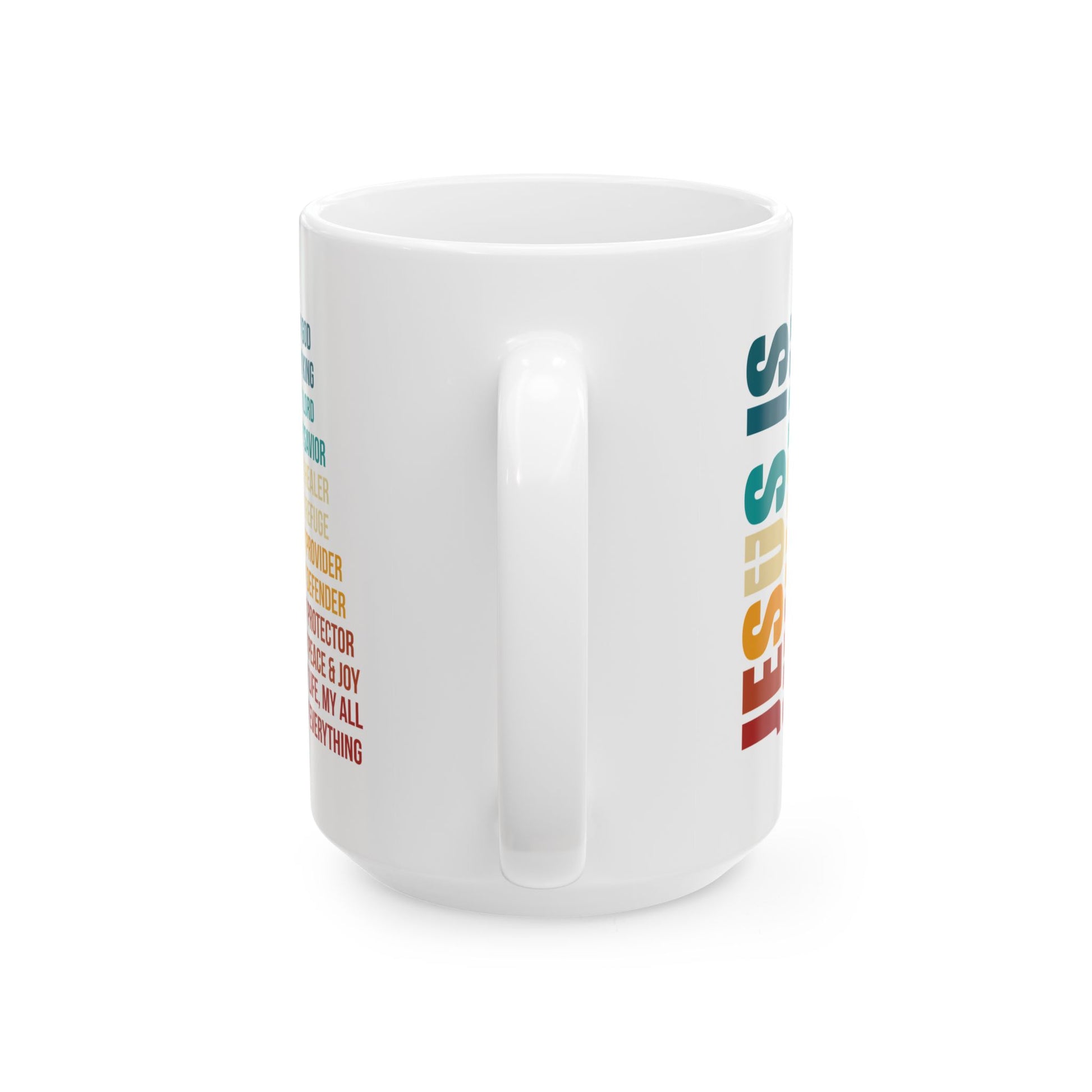 Celebrate your faith daily with this vibrant white ceramic mug, featuring a bold rainbow typography design proclaiming who Jesus is: My God, My Savior, My Protector, My Everything. It's a beautiful and uplifting reminder for your morning coffee or tea.