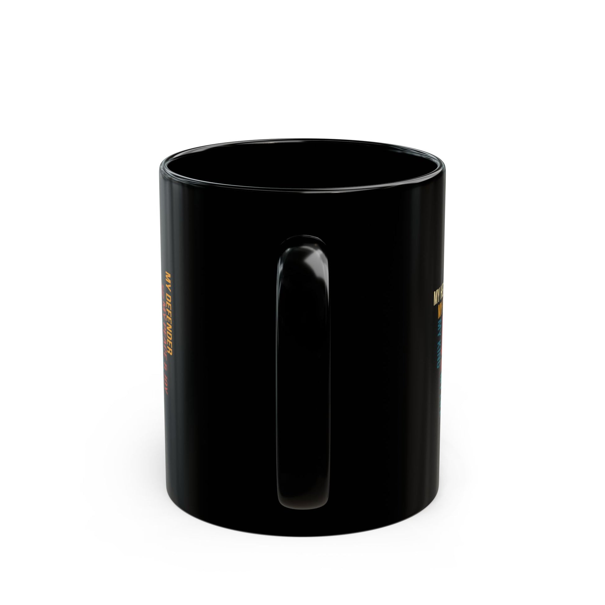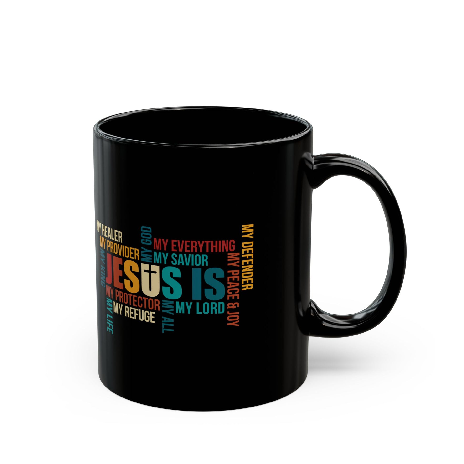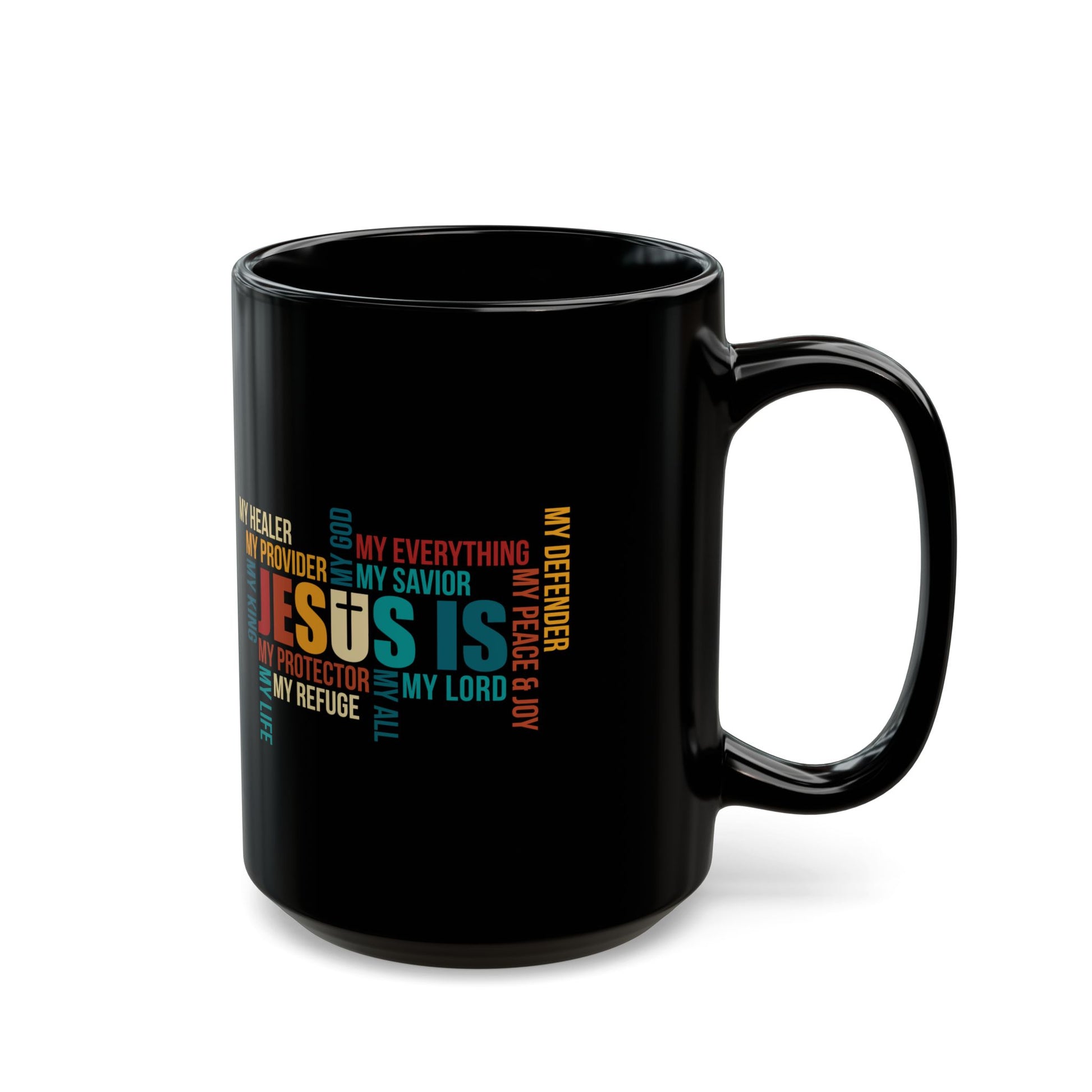 This bold black ceramic mug features a vibrant word cloud centered around Jesus—My God, My Savior, My Refuge, My Everything. With its eye-catching colors and uplifting typography, it's the perfect way to stay inspired with every sip. A beautiful reflection of faith and devotion, this mug makes a meaningful gift for anyone walking in their spiritual journey.