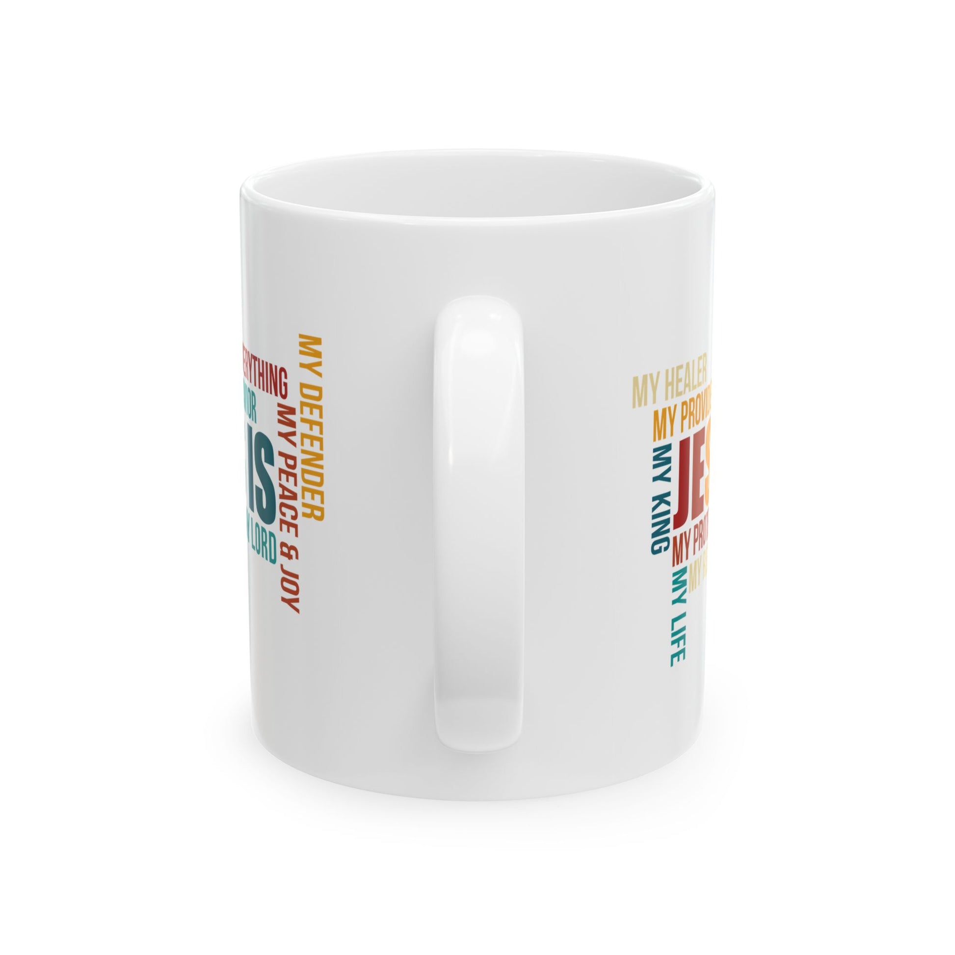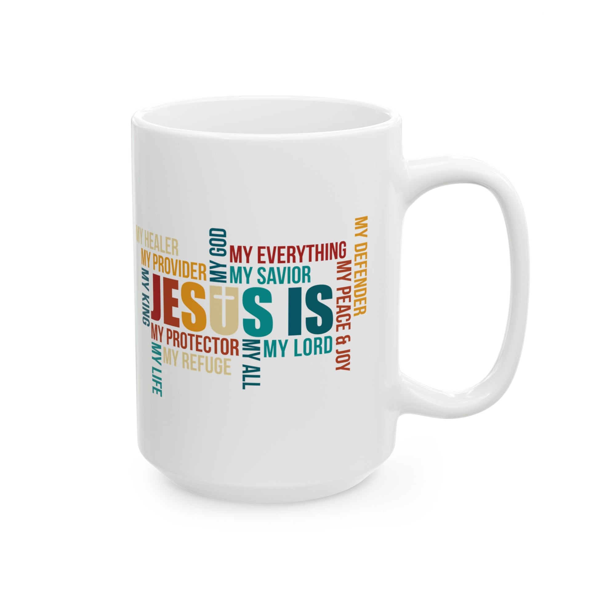 Celebrate your faith daily with this bold and uplifting white ceramic mug featuring a colorful word cloud that highlights all that Jesus is—My God, My Savior, My Provider, My Everything. The modern typography and vivid palette create a unique and faith-affirming design perfect for morning coffee, evening tea, or spiritual reflection.