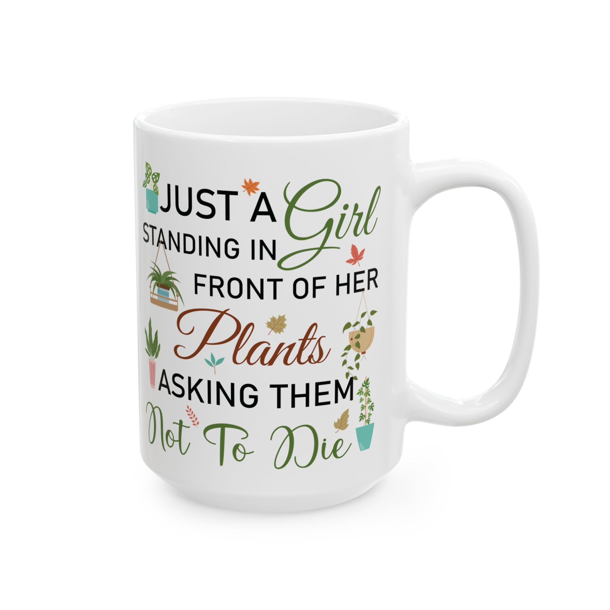 Every plant mom will relate to this charming “Just a Girl Standing in Front of Her Plants Asking Them Not to Die” white ceramic mug. With playful fonts and adorable potted plant illustrations, this mug blends humor with heartfelt green thumb energy.