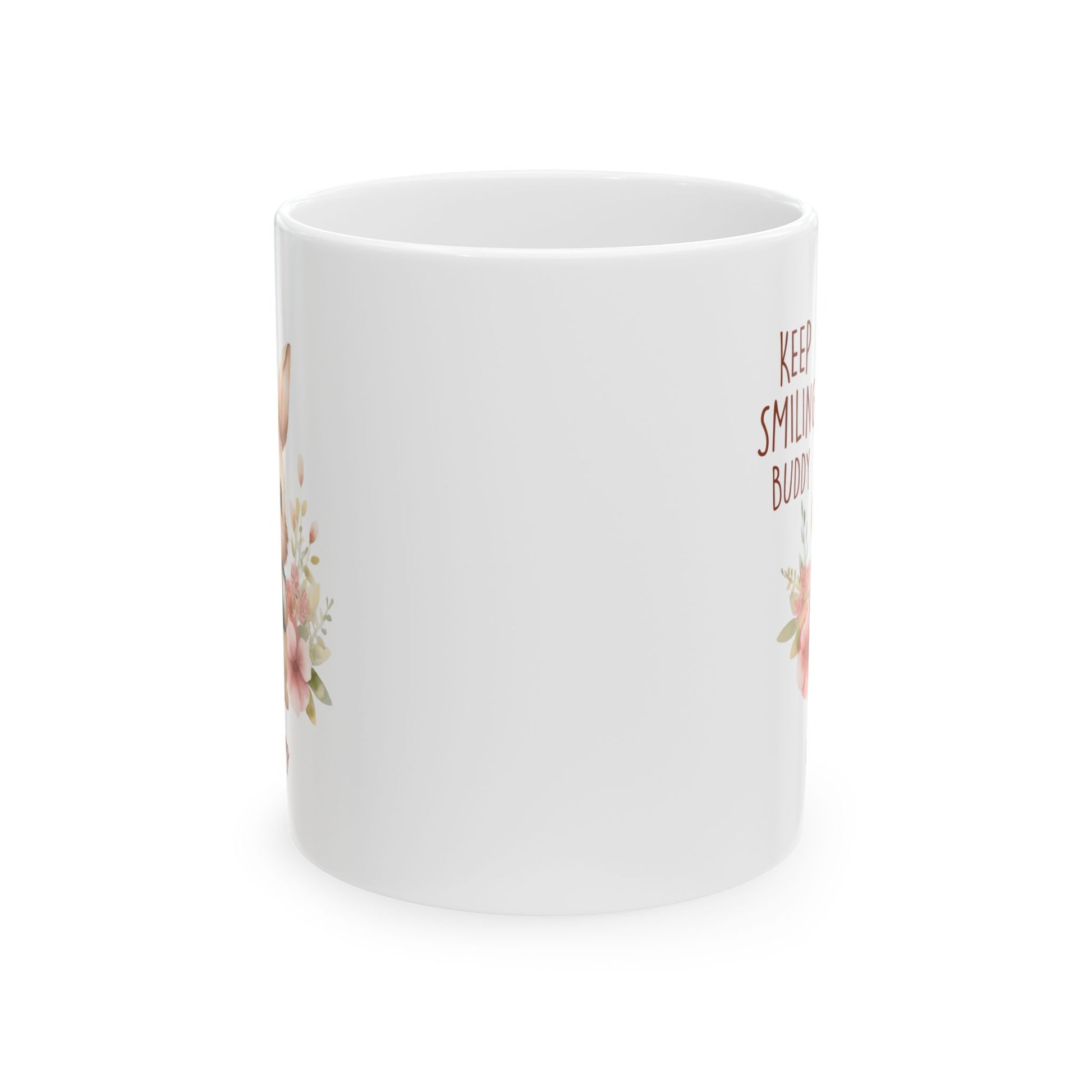 Brighten someone’s day with this adorable Keep Smiling, Buddy bunny mug. Featuring a sweet bunny holding a camera surrounded by soft florals, this mug delivers charm, cheer, and a gentle reminder to smile. Add a name for a personalized touch that makes it a perfect keepsake.