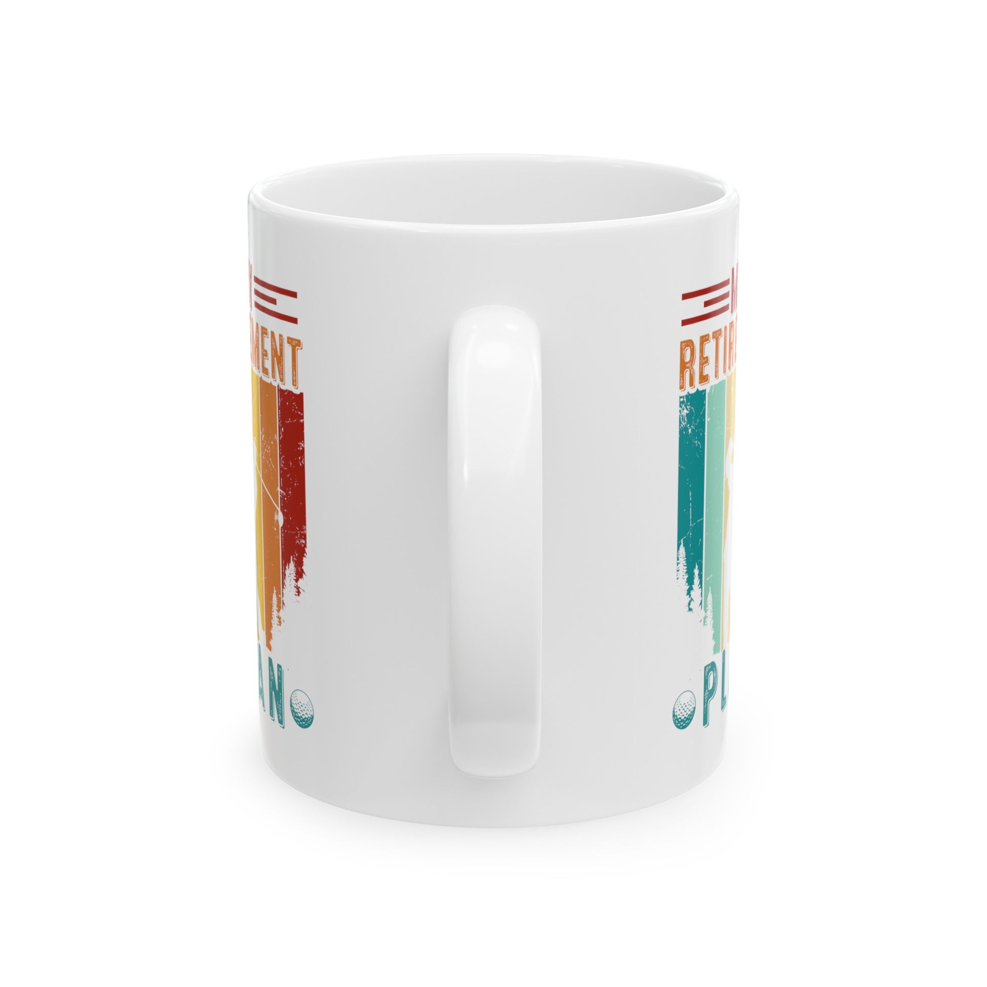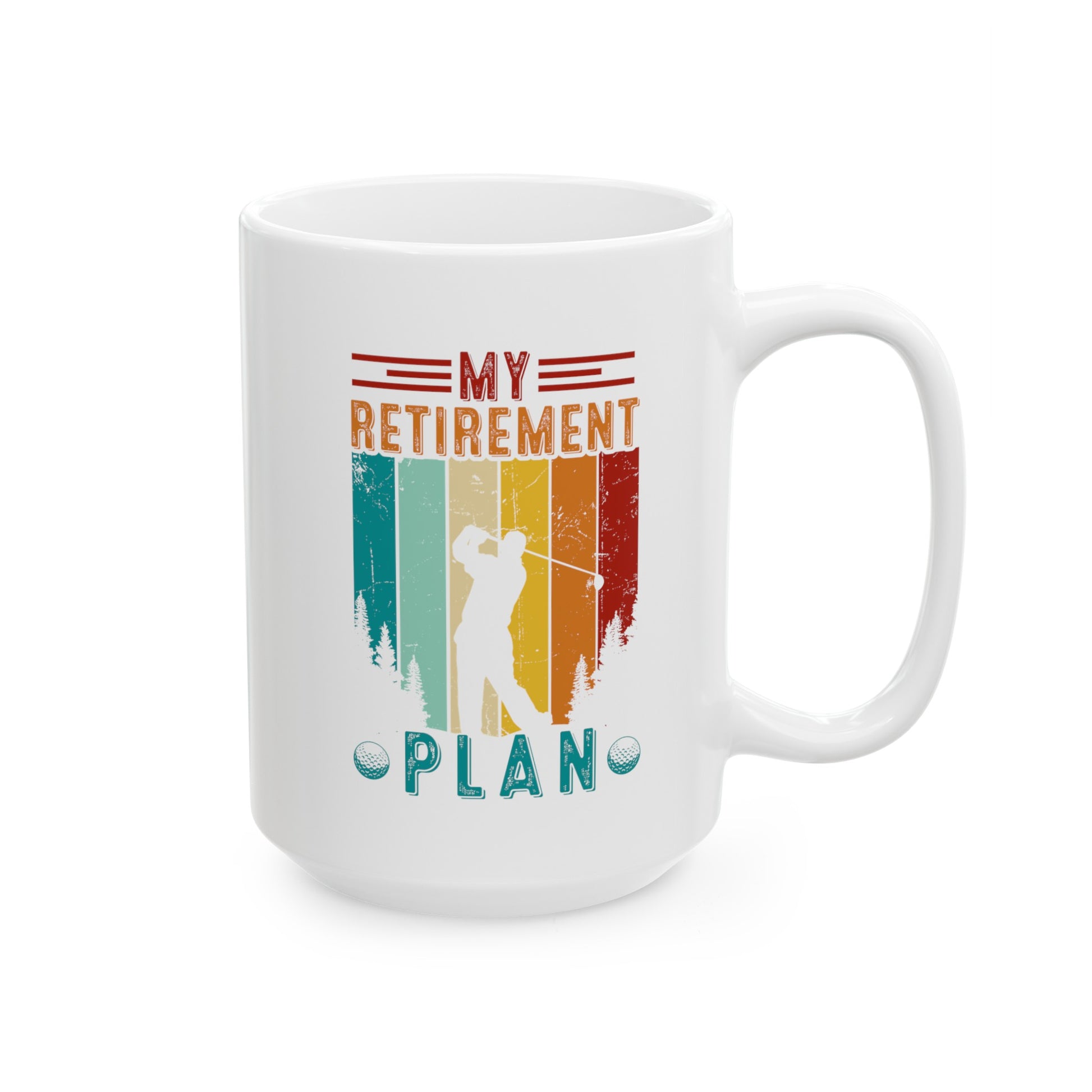 Celebrate the leisure of retirement with our "My Retirement Plan" mug. This crisp white mug showcases a vibrant, vintage-style golf silhouette design, perfect for those who plan to spend their retirement days on the green. A great gift for any golf enthusiast who is heading into or enjoying their retirement, this mug is ideal for morning coffees before hitting the golf course.