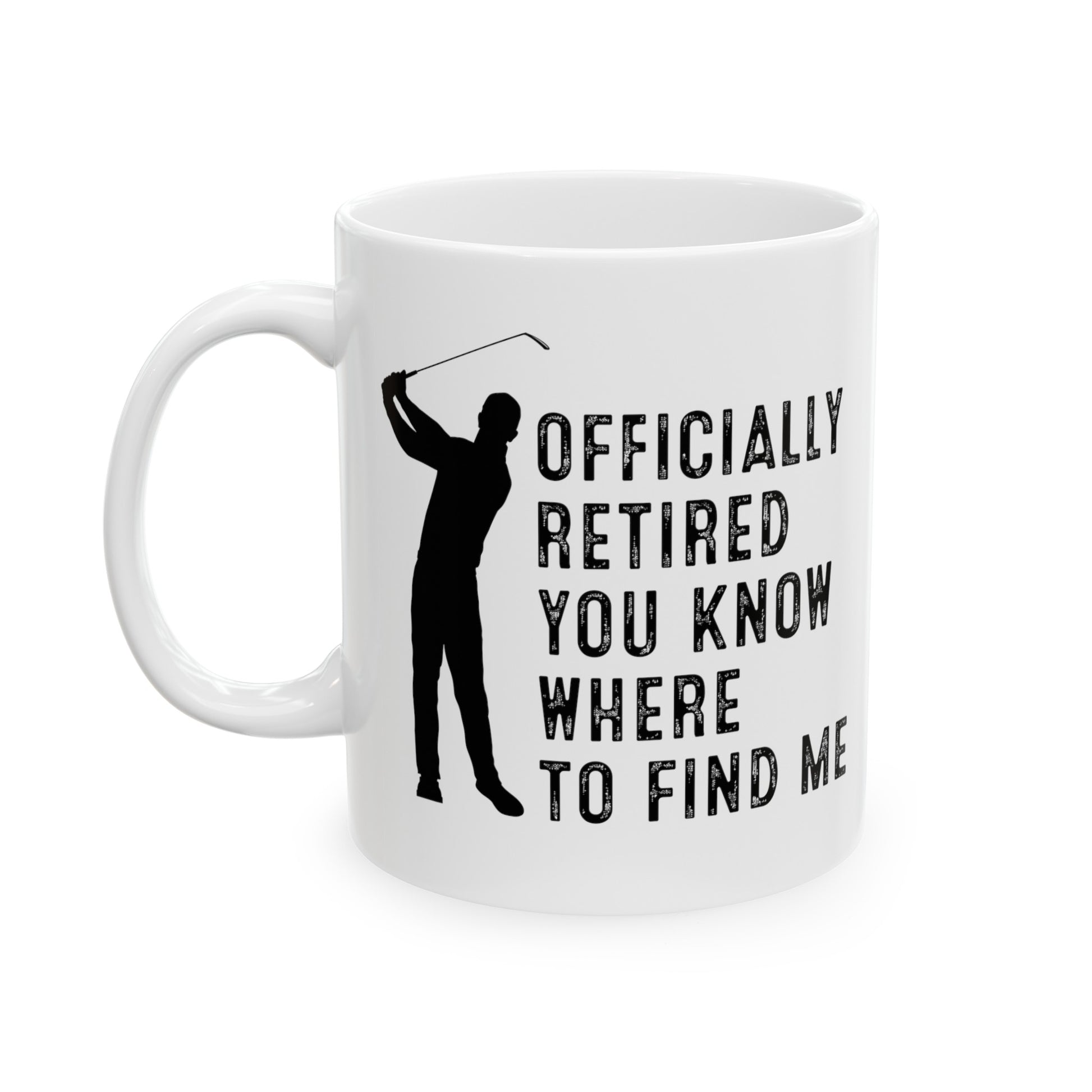 Celebrate retirement in style with our Officially Retired Golf Mug! This fun and stylish mug features a golfer silhouette and the humorous message: "Officially Retired, You Know Where to Find Me." Perfect for retirees who are ready to spend their days on the golf course. Whether you're buying for a loved one or treating yourself, this mug is a great way to enjoy your morning coffee while embracing the new phase of life. A wonderful gift for anyone who has traded in their office chair for a set of golf clubs.