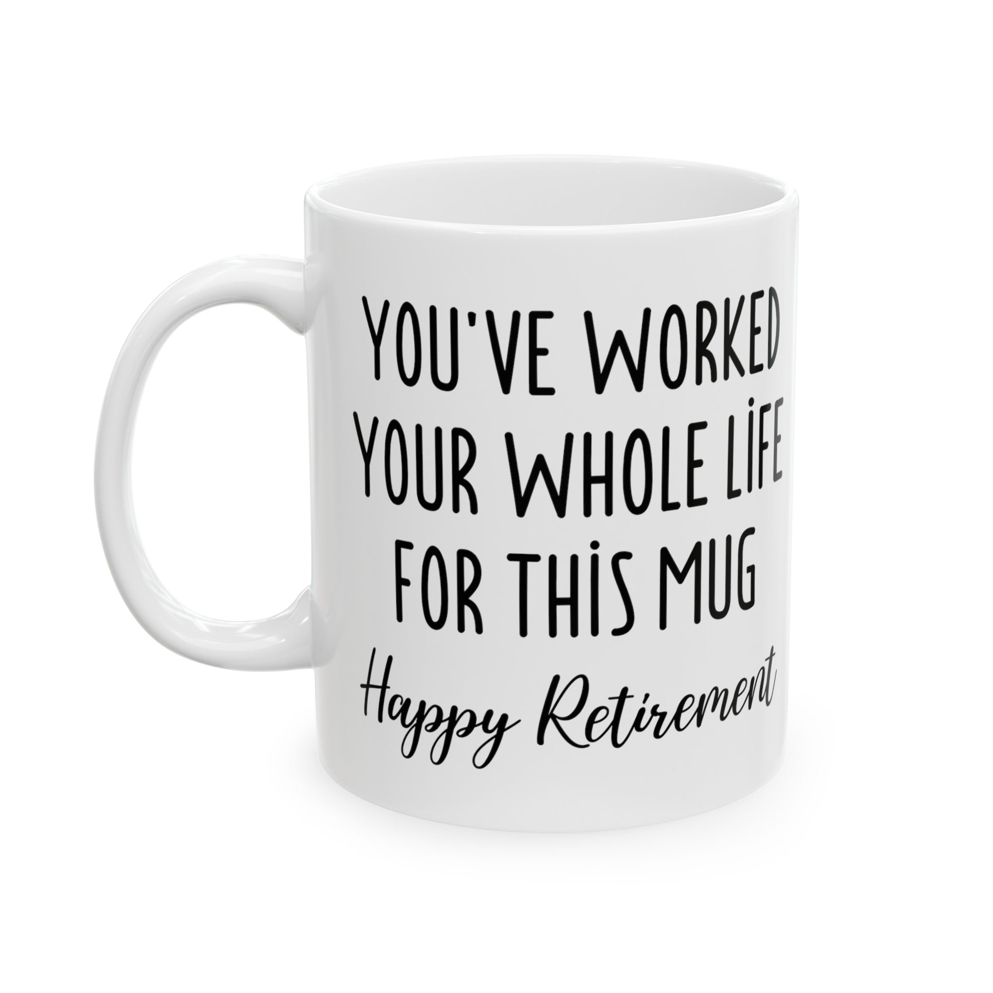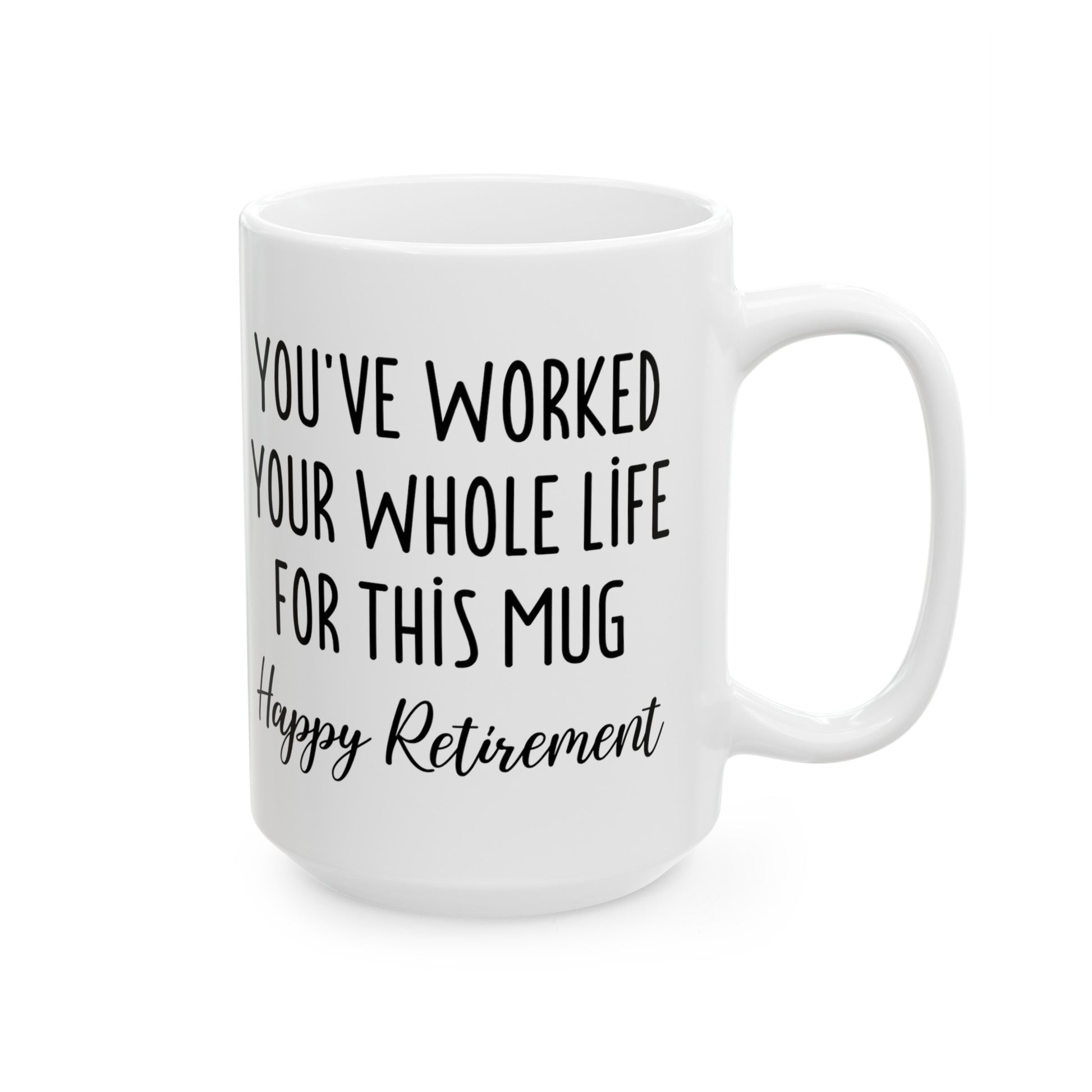Celebrate the years of hard work with a mug that makes a statement! This humorous retirement mug reads, "You’ve Worked Your Whole Life for This Mug," and is the perfect way to mark the start of a new chapter. Featuring a fun design and the message "Happy Retirement," it's a great gift for anyone stepping into retirement and ready to relax with their favorite drink. A fun, lighthearted way to wish them well as they embark on their retirement journey!