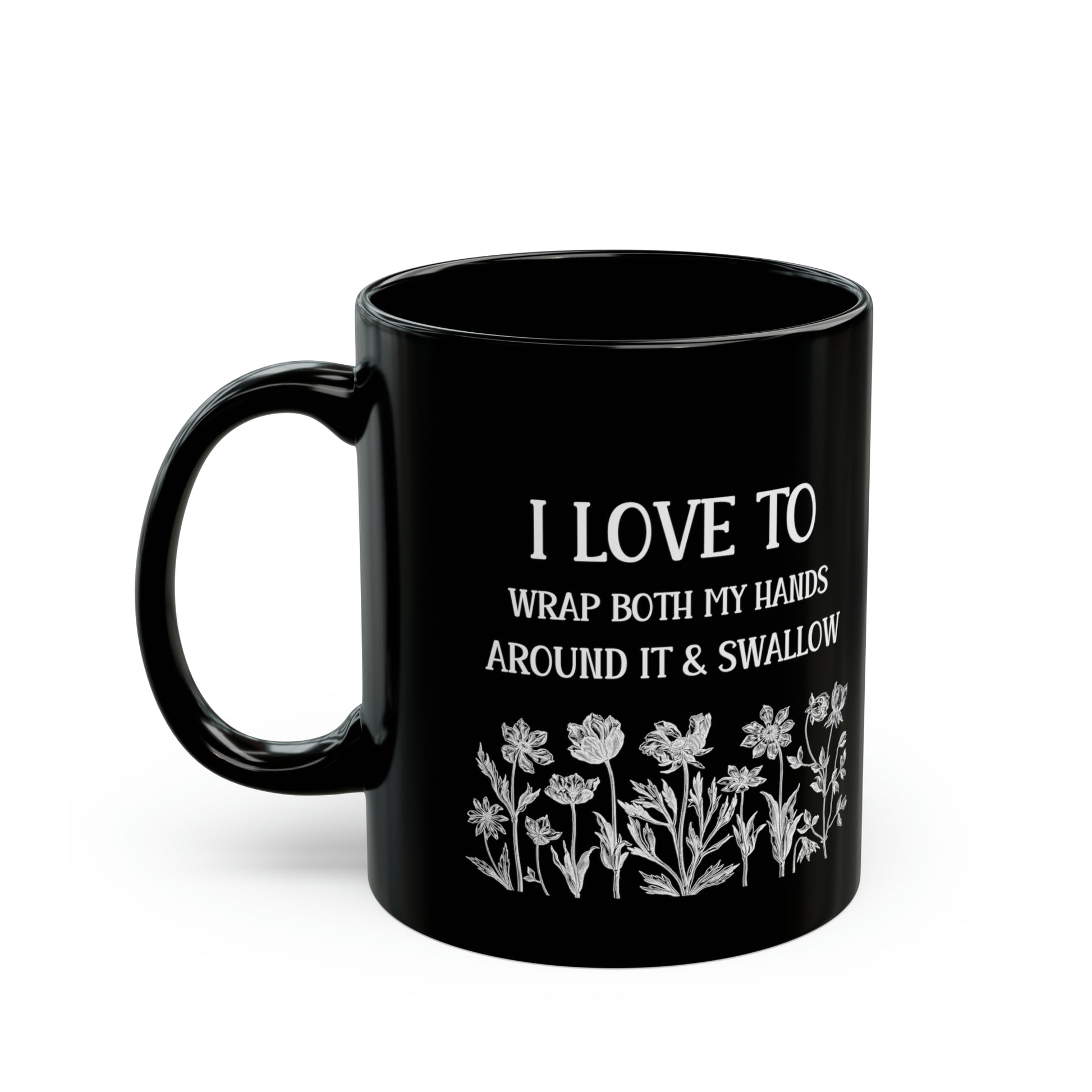 Product Description: Add a touch of humor to your daily routine with this funny black mug featuring the phrase "I Love To Wrap Both My Hands Around It & Swallow" paired with a charming floral illustration. Perfect for those who enjoy sarcasm with their morning coffee or tea, this stylish mug makes a great gift for coffee lovers, friends, or anyone with a sense of humor. Start your day with a smile and enjoy your favorite beverage in this witty and elegant cup.