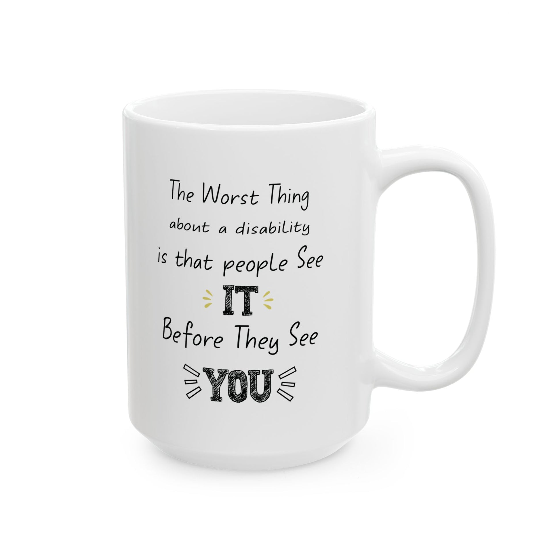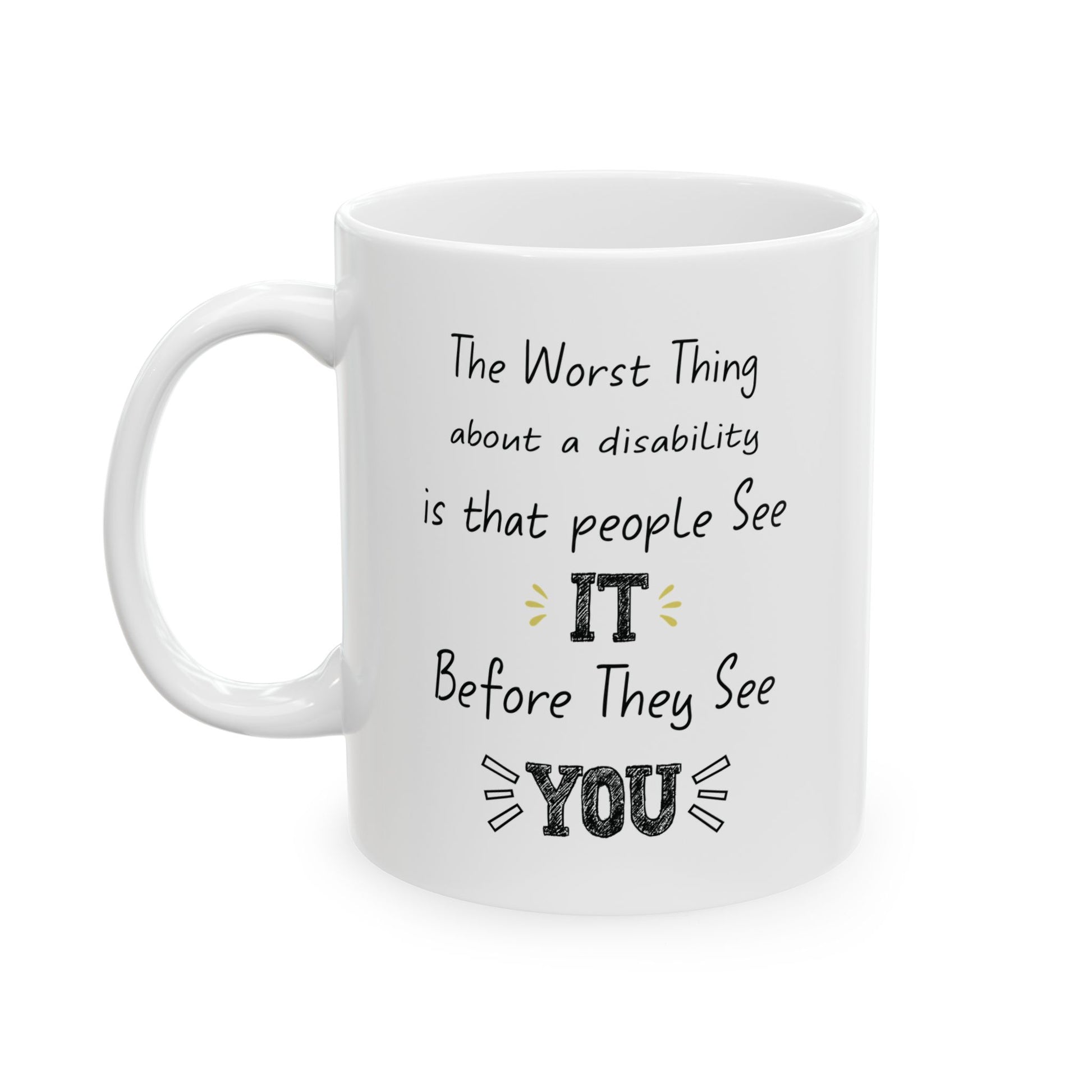 Show support, raise awareness, and inspire change with this white ceramic mug featuring a heartfelt quote: The worst thing about a disability is that people see it before they see you. It’s a powerful reminder to recognize people for who they truly are—not just their visible challenges.