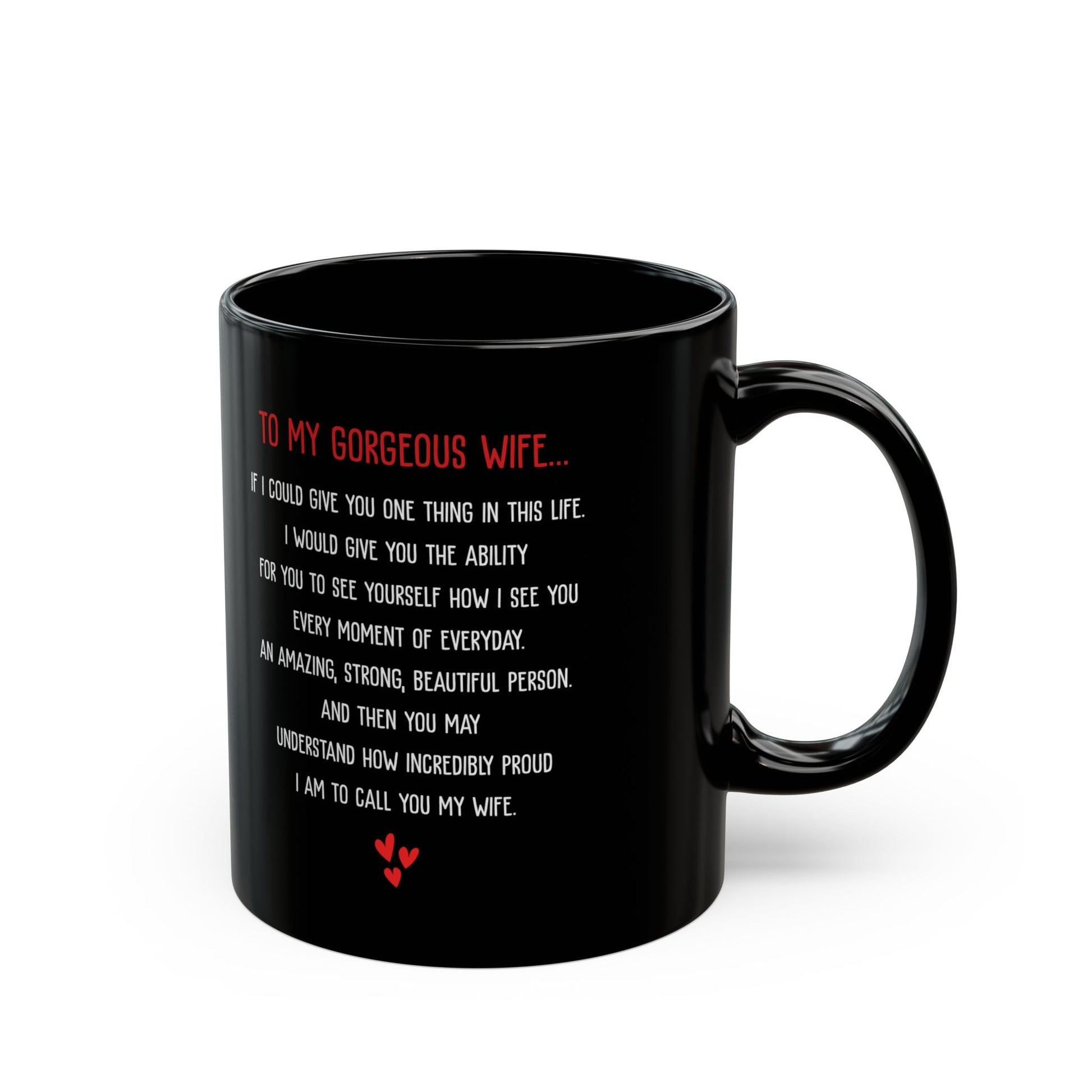 Celebrate your wife with this heartfelt black ceramic mug featuring the touching message: "To My Gorgeous Wife... If I could give you one thing in this life..." It's a romantic gift from a loving husband, perfect for birthdays, anniversaries, Valentine's Day, or just because.