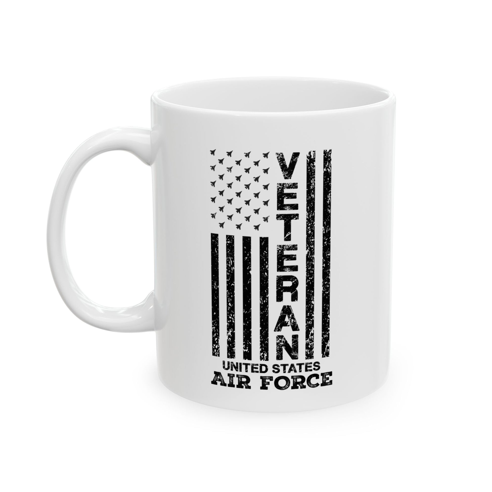 Celebrate American service and sacrifice with this Air Force Veteran Mug, featuring a bold black distressed flag design with “VETERAN” vertically displayed and “United States Air Force” in block print underneath. A standout patriotic coffee cup for anyone who served proudly in the USAF.